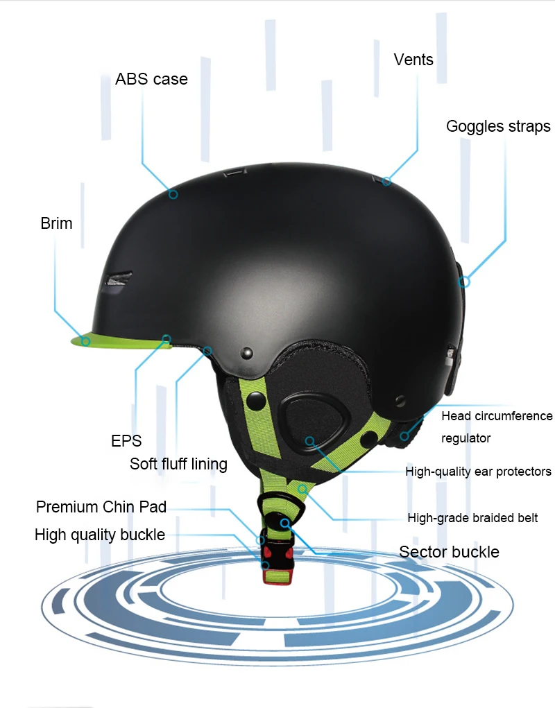 Характеристика: Цвета: черный/белый/зеленый/синий Размер (окружность головы):S(50-54 см), M(54-58 см), L(58-61 см) Сертификация: CE Материал: АБС + пенополистирол Ухо, хлопковая подкладка сохраняет тепло, регулируемая окружность головы Посылка: 1 * лыжный шлем