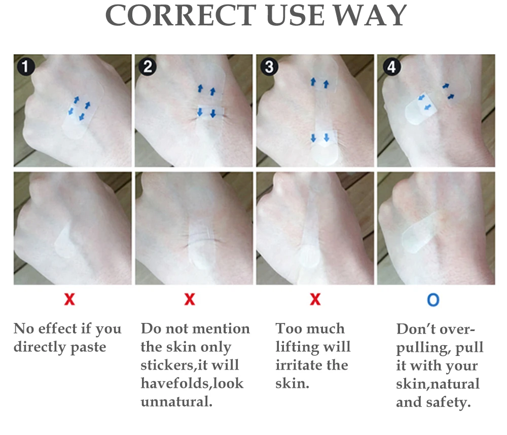 1/нет эффекта, если вы непосредственно вставляете 2/не указывайте на кожу только наклейки, это будет Складки, выглядят неестественно. 3/слишком сильный подъем раздражает кожу. 4/не перетягивайте, потяните его своей кожей, естественно и безопасно.