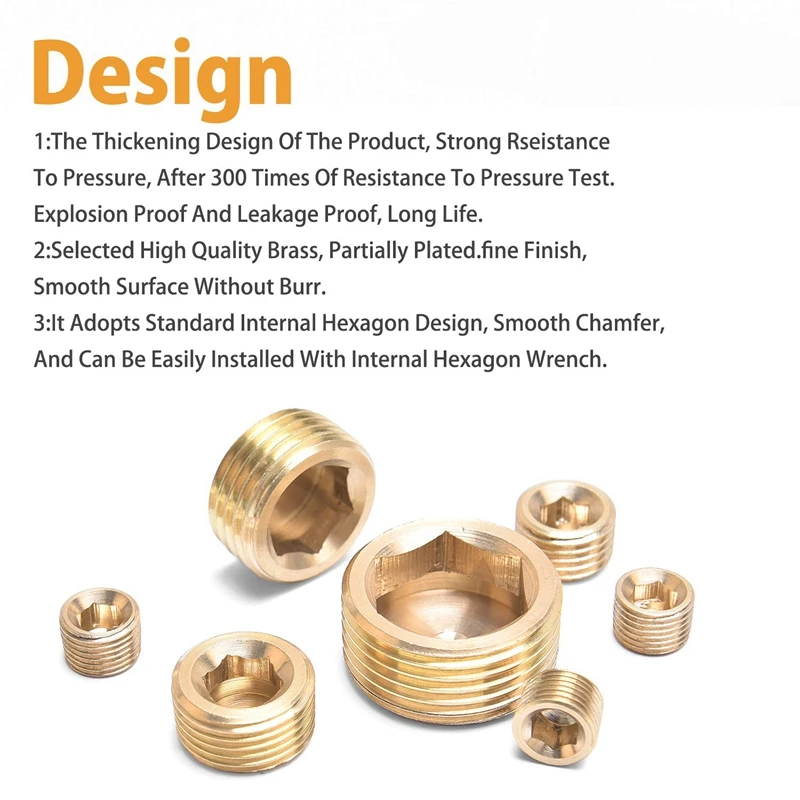 Изготовлено из высококачественной металлической латуни с превосходными антикоррозийными свойствами, подходящими для использования во влажной среде, эти потайные шестигранные заглушки можно широко использовать для коммерческих, промышленных, автоматических, лодок, санитарных труб и фитингов.
