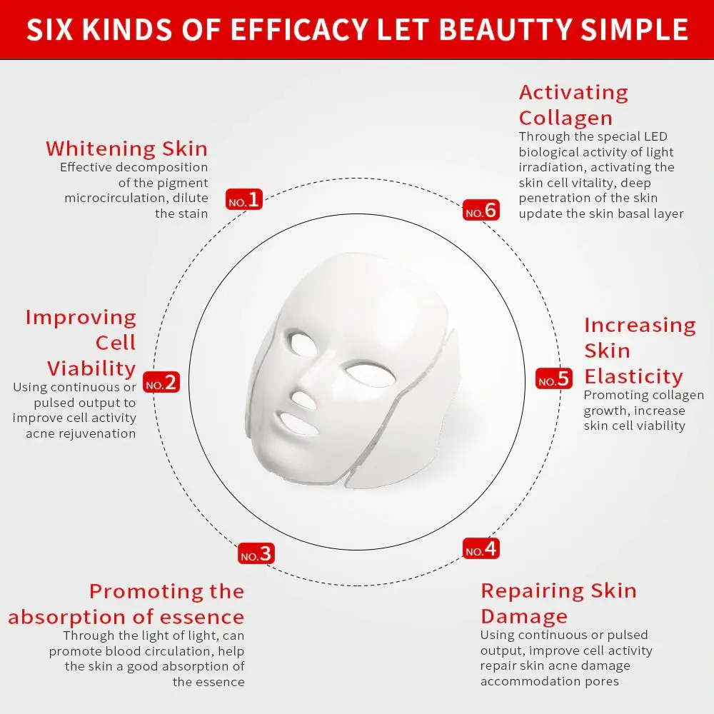 Красный светильник: Отбеливающее бледное пятно, нежная кожа и против морщин, восстанавливает поврежденную кожу, разглаживает мелкие морщинки, сокращает поры, гиперплазию коллагена. Синий светильник: эффективно минимизирует и лечит акне, восстанавливает кожу, оставляя шрамы Фиолетовый светильник: это красный и синий двухполосный светильник, сочетание двух видов эффекта фототерапии, особенно при заживлении и ремонте шрамов от акне Лазерный светильник (белый светильник): разрешение возрастных пятен, улучшение тонких линий и провисание кожи. Зеленый светильник: нейтрализация, баланс состояния кожи, снятие умственного стресса и эффективное дренажное лимфомирование и отек Желтый светильник: улучшает грубую кожу и морщины, покраснение, жар, кожный червь, повышает иммунитет Зеленый синий светильник: увеличивает энергию клеток постепенно, способствует метаболизму