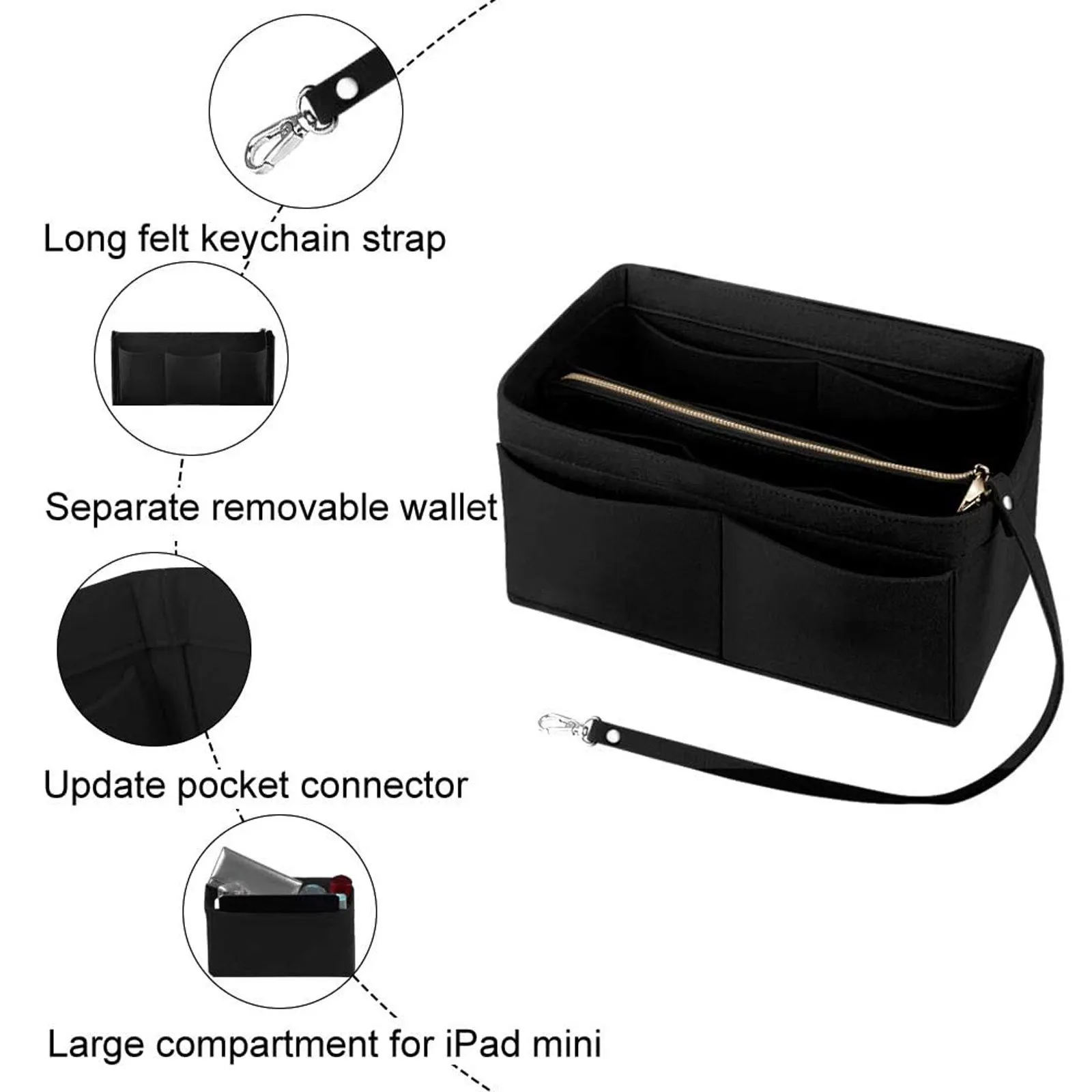 [MULTI-POCKET & SINGLE DETACHABLE PURSE] 13 Pockets Total Handbag Organizer, 3 exterior pockets, 10 interior pockets with singly detachable wallte(with zipper) in the middle which can keep valuable articles or used as a separate wallet after detached. Extra detachable long felt keys chain help find the keys easily. [KEY CHAINS DESGIN]: Detachable long key chain make it easy to find the keys when you ouside the door and prevents key loss and ensures safety.It's easy to switch purses and bags throughout the day without having to reorganize. [LIGHTWEIGHT & DURABLE ] Made of Sturdy Felt Fabric, won’t add too much weight to your purse. Durable felt fabric better protect your items, fits for a variety of models handbags, tote bags and backpacks, easily take out and save your time for changing to another handbag or tote bags. [SIZE CHOICE] Medium: (M)10.6*(W)5.9*(H)6.3 inches compatible with Speedy 30 perfectly; Large: (L)11.8 *(W) 6.7*(H)6.3 inches compatible with Speedy 35 and never full MM perfectly; X-Large: (L)13.4*(W)7*(H)6.7 inches compatible with Speedy 40 and never full GM perfectly. All This Purse Organizer Fit For Any Brand With Similar Size. [GREAT TRAVEL TOY CHOICE] The bag insert organizer will be a perfect gift for your girlfriend, wife, mother, daughter, colleague, friends and so on. This compact jewellery case is also a good idea of Valentine's Day Gift, Birthday Gift, Mother's Day Gift, Christmas's Gift, New Year's Gift, Wedding Gift, Engagement Gift, Anniversary Gift and etc.