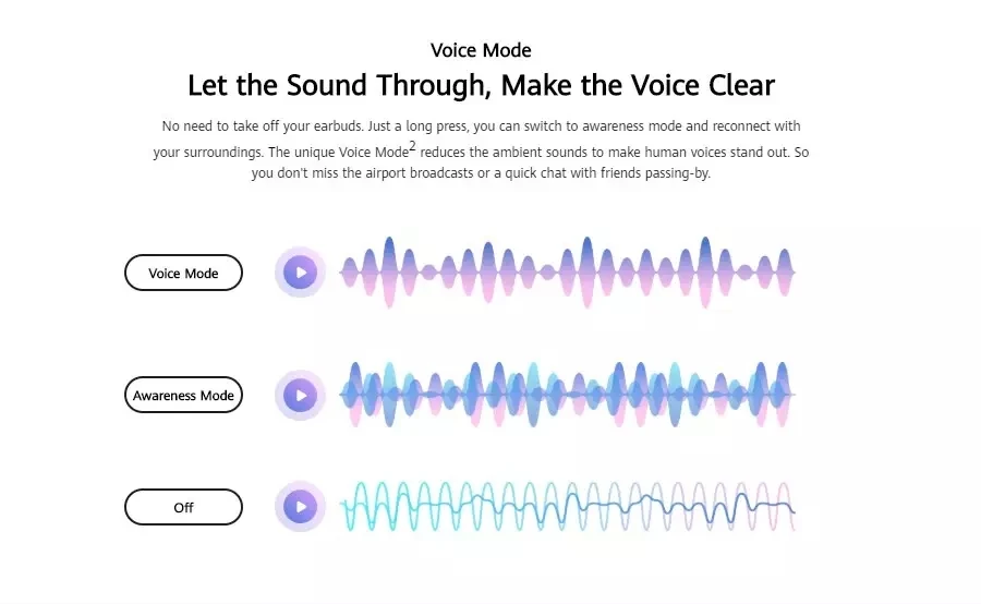 Уникальный Голосовой режим-уменьшает окружающие звуки, чтобы выделиться человеческим голосом. Таким образом, вы не пропустите трансляцию в аэропорту или