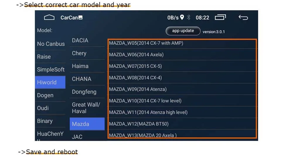 ** Если Вы не нашли правильное имя автомобиля, вам нужно обновить программное обеспечение Android radio или попытаться установить другое имя автомобиля.