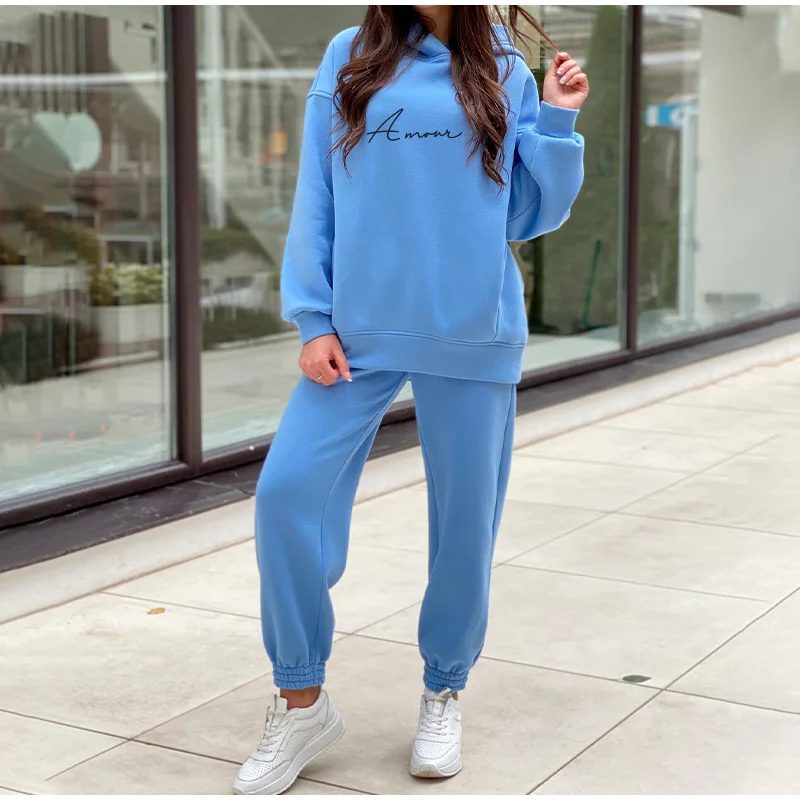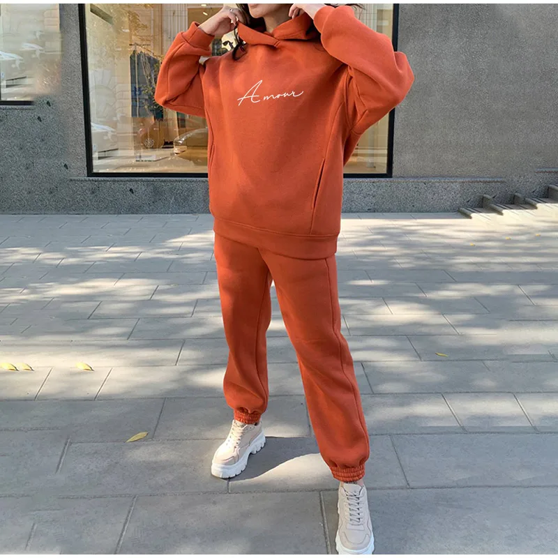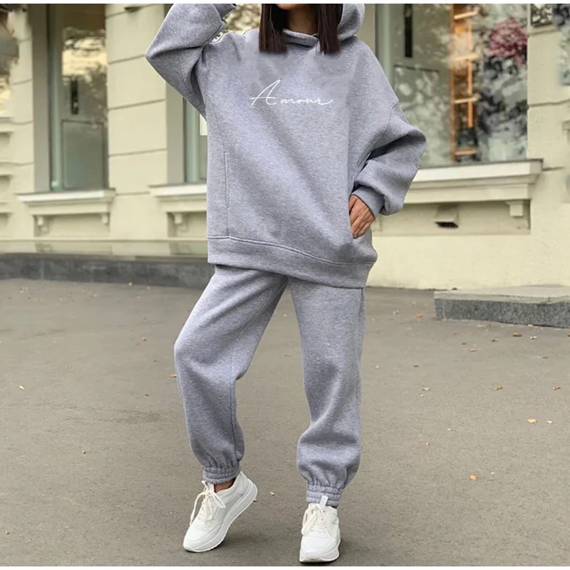 Флисовый спортивный костюм большого размера с буквенным принтом, женские комплекты с капюшоном, Женский костюм с капюшоном, весна-осень, повседневные спортивные штаны, Женский комплект из двух предметов