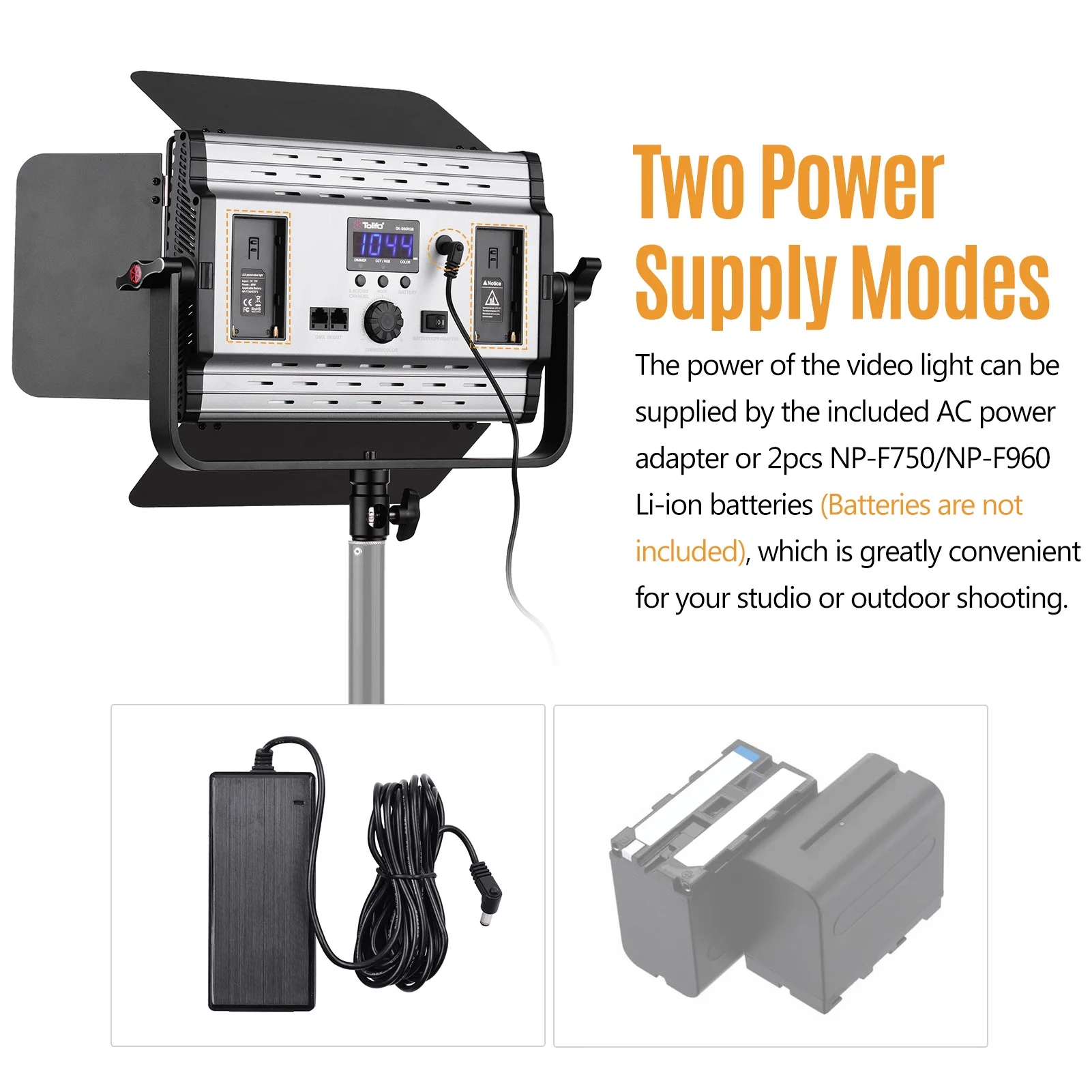 Два режима электропитания:Питание видеосъемки может быть поставлено входящим в комплект адаптером питания переменного тока или 2 литий-ионными аккумуляторами NP-F750/NP-F960 (аккумуляторы в комплект не входят), что очень удобно для вашей студии или съемки на улице.