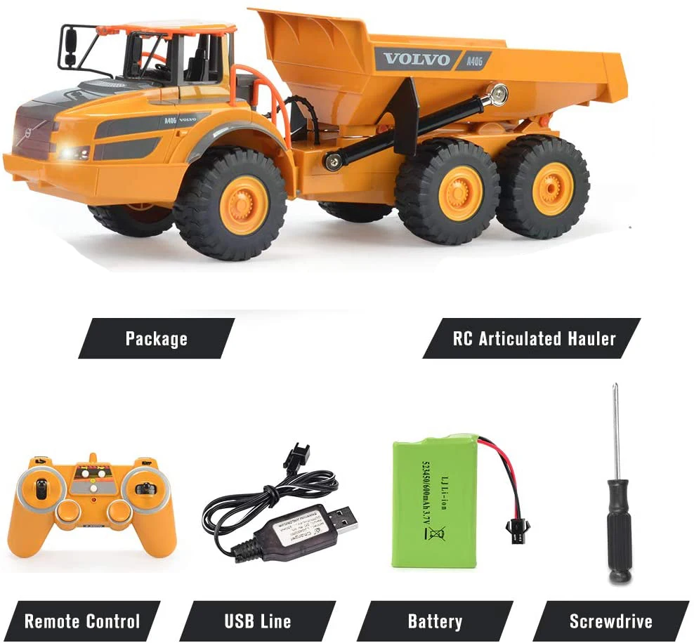 Full function to go forward & backword, turn right & left, digging, rotation,simulated light &sounds,auto-demonstration. Working dump can work up and down for 60 degree, works like a real thing. DEMO desin, one key to show all the contruction process. Professional articulated hauler is the high quality and safe toys for kids. 3.7V 600mAh Rechargeable battery is included, just ready to run with the battery power on.