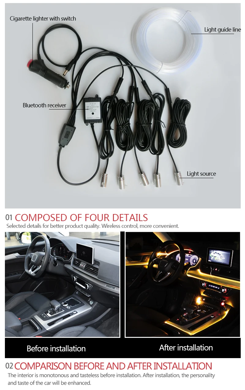 Особенности: 1. Идеально подходит для украшения автомобиля, вечеринок, кемпинга, украшения бара и так далее; 2. Цвета RGB с различными режимами для вас на выбор, 360 градусов регулируется; 3. Гибкий, легко устанавливается, его можно сложить в любую форму и разрезать на любую длину; 4. Управление приложением, легче управлять светильник в любое время и в любом месте; Управление звуком музыки, создание веселой и расслабляющей атмосферы. Спецификация: Напряжение: 12 В Управление телефоном: совместимость с iOS и Android Тип изделия: 2 м (один для одного), 4 м (один для трех) и 6 м (один для пяти) Загрузка приложения: вы просто сканируете qr-код приемника buletooth. Примечания: 1. Фотографии только для справки. Фактический продукт будет превалировать. Ваше удовлетворение-наша главная забота. 2. Пожалуйста, свяжитесь с нами, чтобы лучше решить любую проблему, прежде чем оставлять нейтральные или негативные отзывы. Большое спасибо! Посылка: 1 комплект (включая прикуриватель, световую направляющую линию, приемник buletooth и световую чистку)