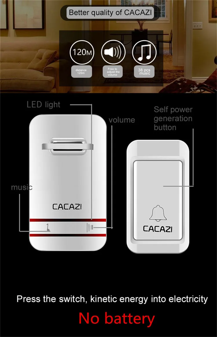 Беспроводной дверной звонок без батареи и без провода. Когда пользователи нажимают кнопку, модуль преобразования энергии внутри изменит механическую энергию в электрическую. Затем беспроводной модуль кнопки отправляет сигналы на приемник. Приемник получает сигналы и воспроизводит музыку/реагирует.