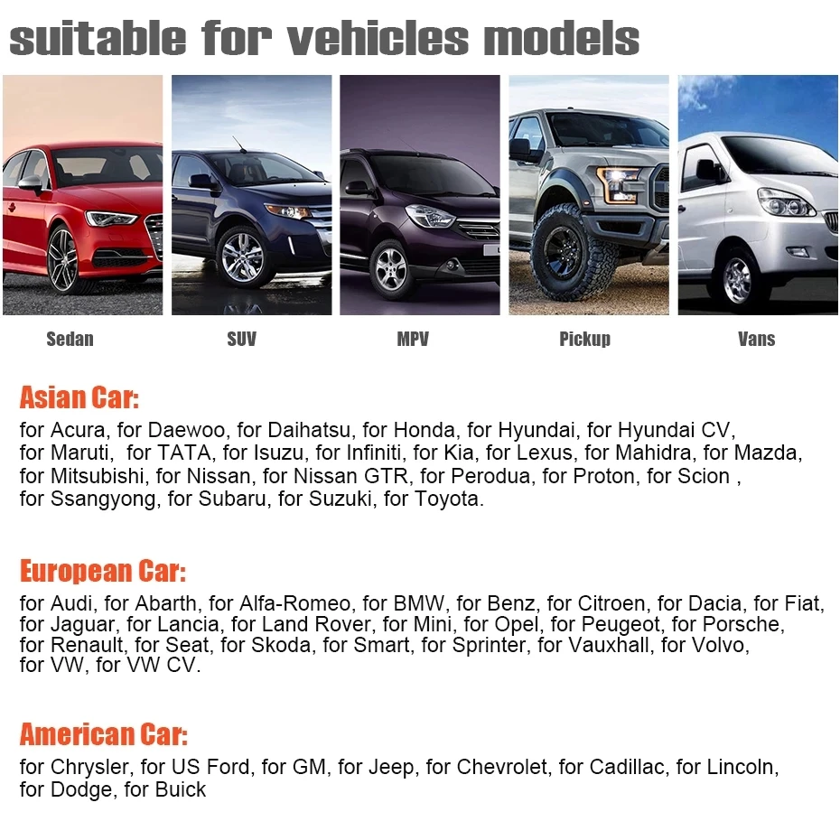 Для Acura, для Daewoo, для Daihatsu, для Honda, для Hyundai, для Hyundai, для марути, для ТАТА, для Isuzu, для Infiniti, для Kia, для Lexus, для Mahidra, для Mazda, для Mitsubishi, Nissan, для Nissan GTR, для Perodua, протон, Для Scion для Ssangyong, для Subaru, для Suzuki, для Toyota.