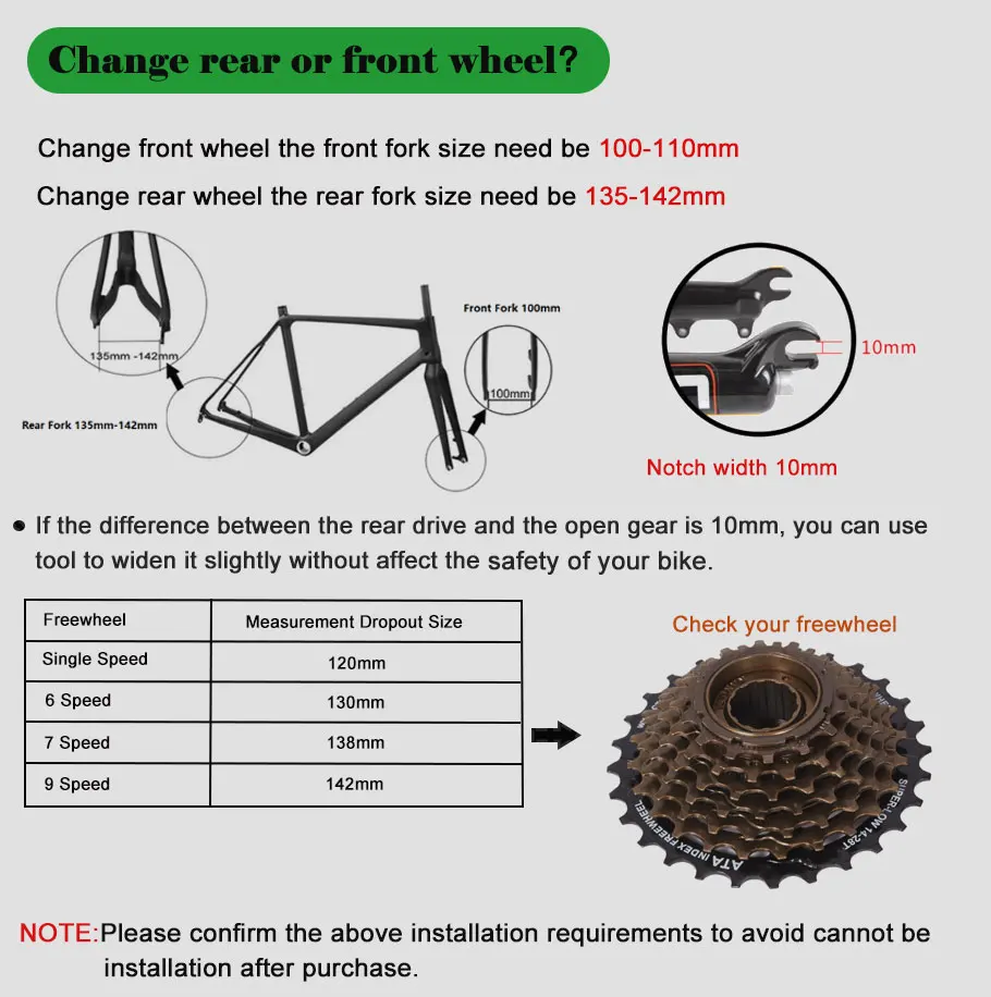 ▶Выпадение переднего колеса100-110 мм, Отвод заднего колеса135-142 мм