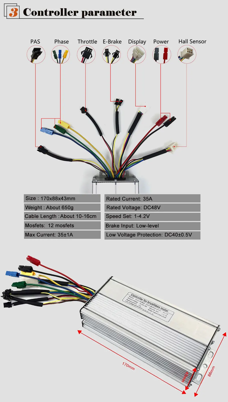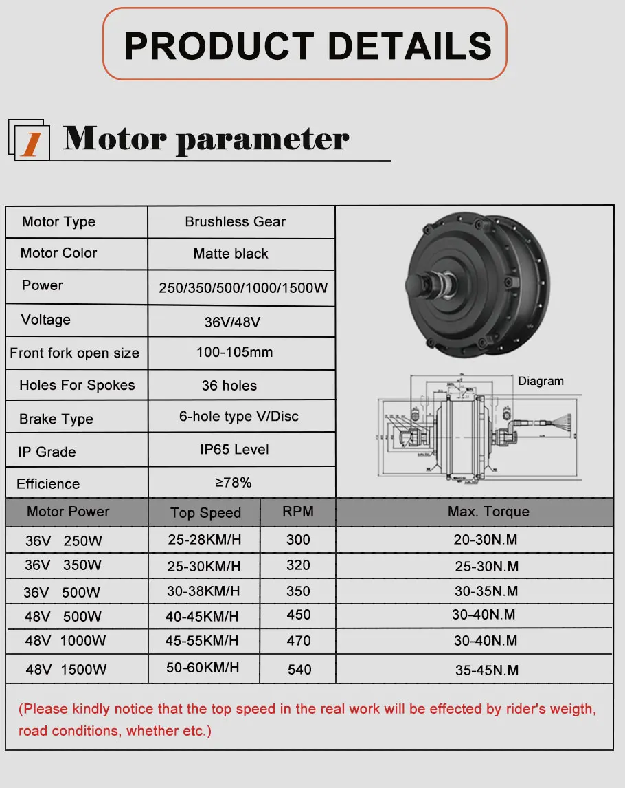 2. Место установки: спереди/сзади 3. С двойной стенкой из алюминиевого сплава обода с 36 люверсами, спицами из нержавеющей стали 4. Дисковый тормоз в наличии 5. Номинальная скорость = 45 км/ч. 6. Нагрузка ≤ 200 кг 7. Длина кабеля двигателя = 1800 мм 8. Размер колеса: 20 дюймов 24 дюймов 26 дюймов 27,5 дюймов 28 дюймов 29 дюймов 700c колеса 9. Задняя вилка: 135-142 мм 10. Нм: 57,5-59 об/мин: 325-331 Размер контроллера (контроллер 35A) Размер: 172*88*43 мм Mosfet : 12 Mosfets Максимальный ток: 35 ± 1A Номинальный ток: 17A Номинальное напряжение: DC36V/48V Скорость комплект: 1-4,2 V Вход тормоза: низкий уровень Защита от низкого напряжения: DC30/40 ± 0,5 V Длина кабеля: около 10-16 см Вес: около 650 гЗдравствуйте. хотела оставить отзыв о преобретенном товаре. Очень классный стеллаж, заказывали данный товар у поставщика под наш лофт дизайн. Нашли... Читать отзыв полностью...