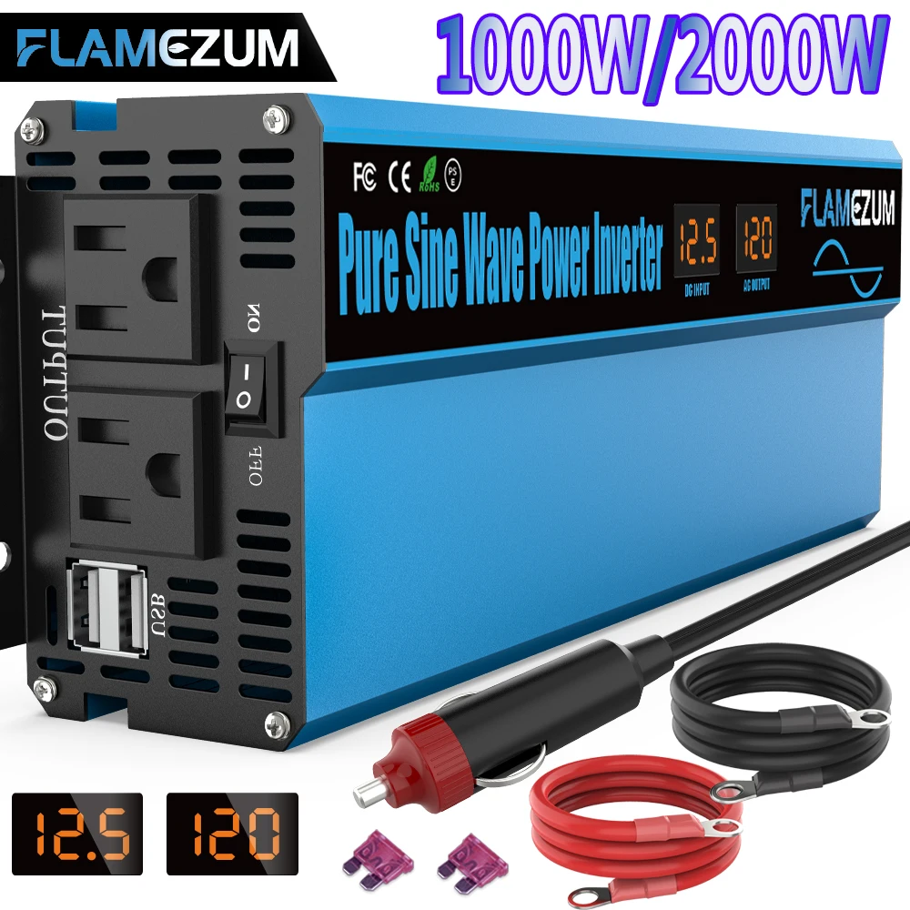 2000 Вт Чистая синусоида Инвертор 1000 Вт DC 12 В к AC 120 в 220 В 230 в 240 В для автомобиля инвертор с кабелем автомобиля 2 USB ЖК-дисплей