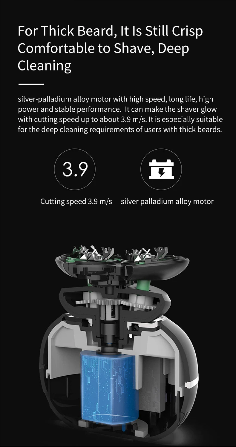 Мотор из Серебристо-палладиевого сплава с высокой скоростью, долгим сроком службы, высокой мощностью и стабильной производительностью. Он может сделать бритва светятся при резке скорость передачи данных до около 3,9 м/с. Он особенно подходит для глубокой очистки пользователей толстыми бородами.