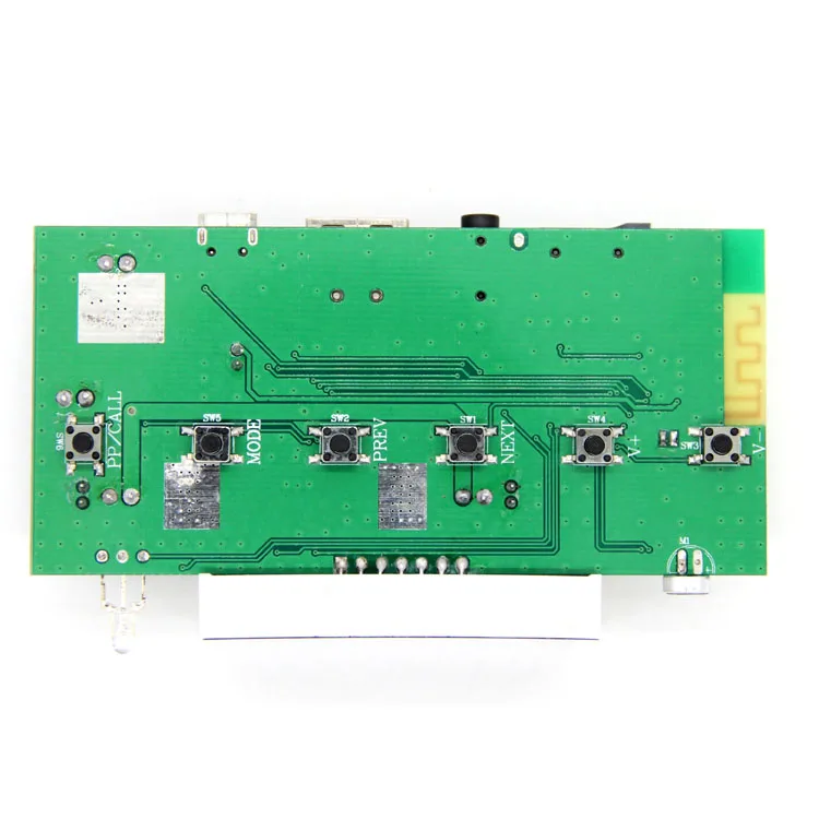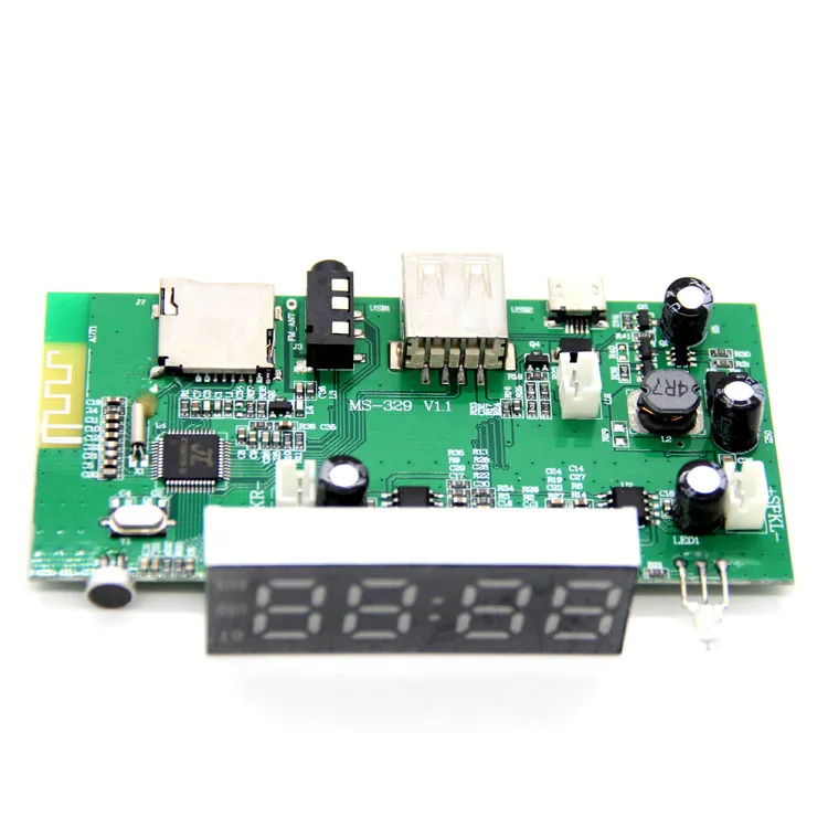 Размер платы усилителя мощности: длина 9,2 см X ширина 5,3 см X высота 2 см 1. Воспроизведение U-диска 2. Аудиовход AUX 2. FM-радио (в режиме FM короткое нажатие «PP/CALL» для поиска каналов) 3. Карта TF 4. Воспроизведение по Bluetooth 5. Привод 2x4O3W 6. Переключатель 7. С функцией зарядки 8. Дисплей часов Введение трафаретной печати на плате: SPKR +, SPKR-, SPKL +, SPKL-это положительное и отрицательное соединение динамика, BAT-Это положительное и отрицательное соединение литиевой батареи, а MicroUSB-порт для зарядки. Примечание: Не подключайте порт MicroUSB для источника питания, Вам необходимо подключить литиевую батарею. При использовании FM обязательно Подключите провод AUX (в качестве радиоантенны)