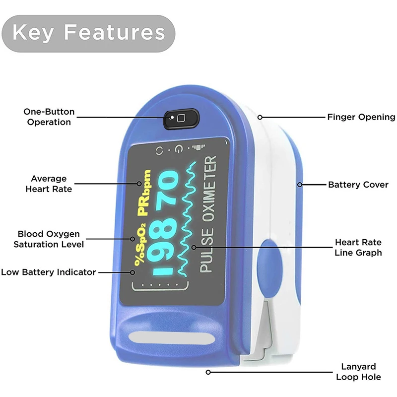 Для любителей спорта, таких как горные альпинисты, лыжники, байкеры или тех, кто заинтересован в измерении их скорости SpO2 и пульса.Этот продукт подходит для больниц, кислородных балок, спортивного здоровья (с их использованием до или после занятий спортом, не советуем использовать их во время движения), а также для общественного здравоохранения и т. д.Особенности:Сохраняйте равновесие во время теста, Не трясите вверх и вниз, не Тренируйтесь энергично и сохраняйте спокойствие1. Цвет: черный/синий2. Материал: АБС-пластик3. Размер: около 6x3.5x3.5cm.4. Он может контролировать насыщение крови кислородом и параметры пульса. И есть дисплей импульсной схемы импульса.5. Функция автоматического отключения около 8 секунд, когда нет сигнала.6. Используйте две батарейки AAA, низкое энергопотребление.7. Светильник небольшой по размеру и легко носить с собой.8. Простота в использовании, управление одним ключом.Примечание:Не зажимайте пальцы askew, не мочите руки и не используйте посторонние предметы для ногтейФакторы, влияющие на мониторинг насыщения крови кислородом:1. Слишком длинные ногти, лак для ногтей повлияет на обнаружение сигнала2. Помехи сильный светильник на сигнале3. Шок пациентов, температура кожи слишком низкая4. Измерение артериального давления в ipsilateral arm влияет на пульсацию периферических кровеносных сосудов и затрудняет измерениеУпаковочный лист1 x Пульсоксиметр
