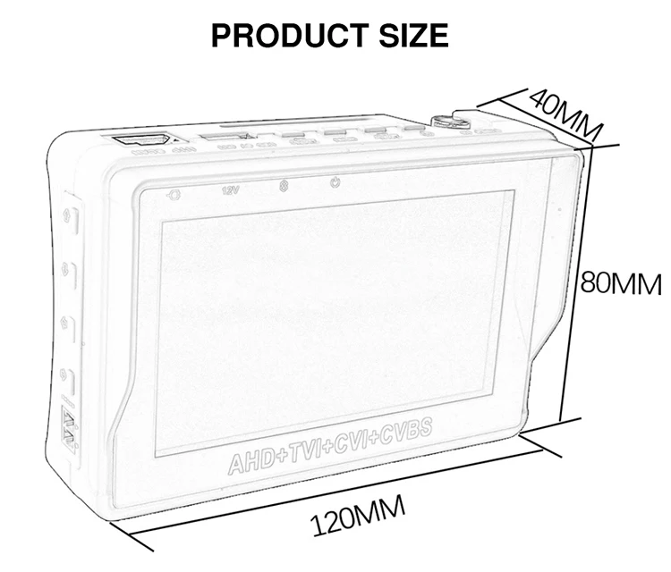 Поддержка CVBS + AHD (8MP) + TVI (8MP) + CVI (8MP) Тест камеры + HDMI выход, 4-в-1 CCTV Тесты er Monitor.5.0 дюйма 800x480 с высоким разрешением угол обзора дисплея, более интуитивно понятным и простым в использовании отображения Камера качество изображения, Поддержка система цветного телевидения PAL/NTSC стандарт видео сигнала.