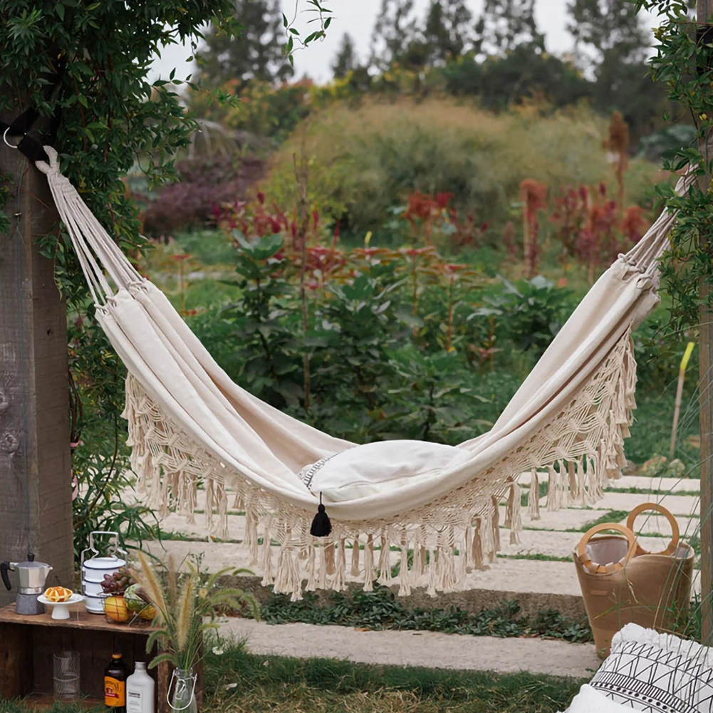 * 2. Вместительный и удобный: Этот гамак размером 200 см х 150 см, с достаточным пространством для отдыха двух человек. Мягкий, плотный хлопок способен удерживать 250 кг.