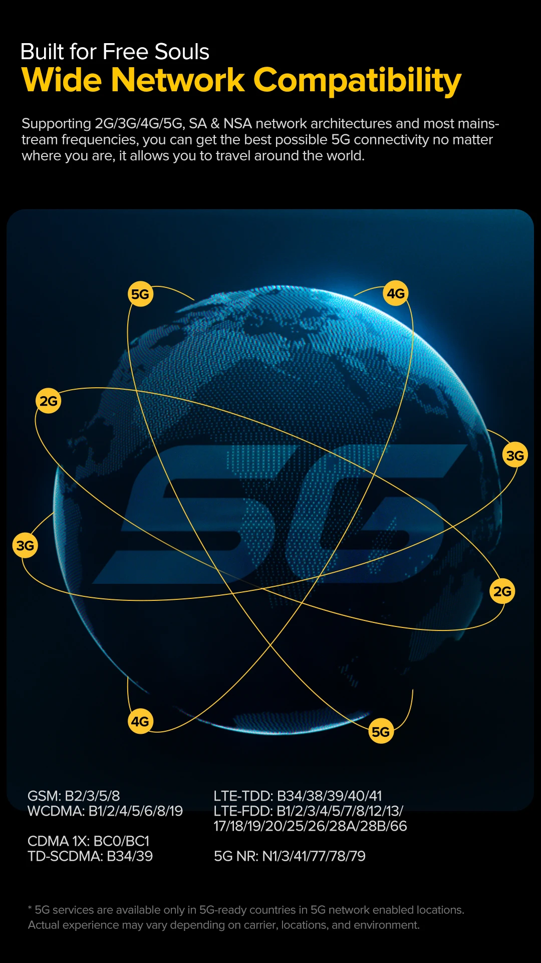 Поддержка сетевых архитектур 2G/3G/4G/5G, SA & NSA и большинства основных частот, вы можете получить наилучшее возможное 5G подключение независимо от того, где вы находитесь, она позволяет путешествовать по всему миру.