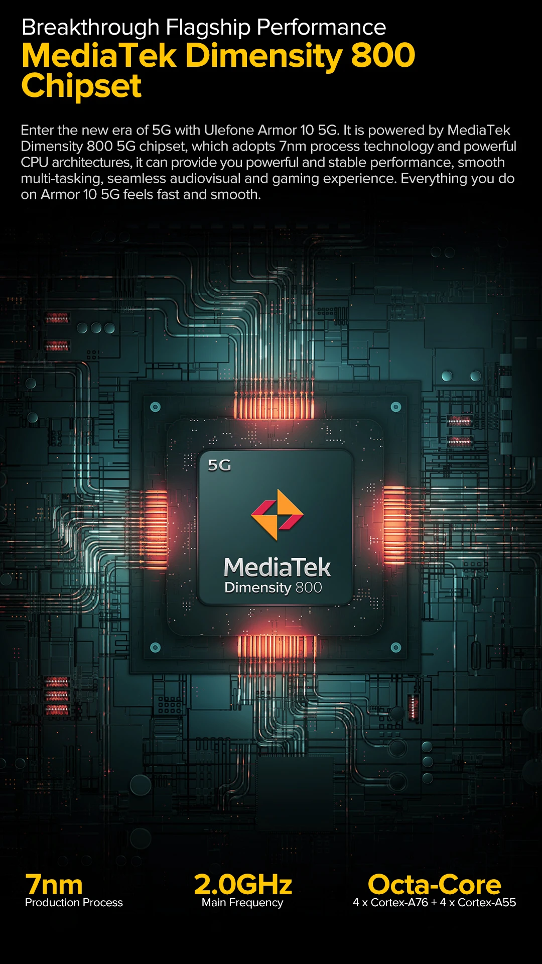 Войдите в новую эпоху 5G с Ulefone Armor 10 5G. Он работает от чипсета MediaTek Dimensity 800 5G, который использует технологию обработки 7 нм и мощную архитектуру процессора, он может обеспечить вам мощную и стабильную производительность, плавную Многозадачность, бесшовный Аудиовизуальный и игровой опыт. Все, что вы делаете на Armor 10 5G, чувствует себя быстро и гладко.