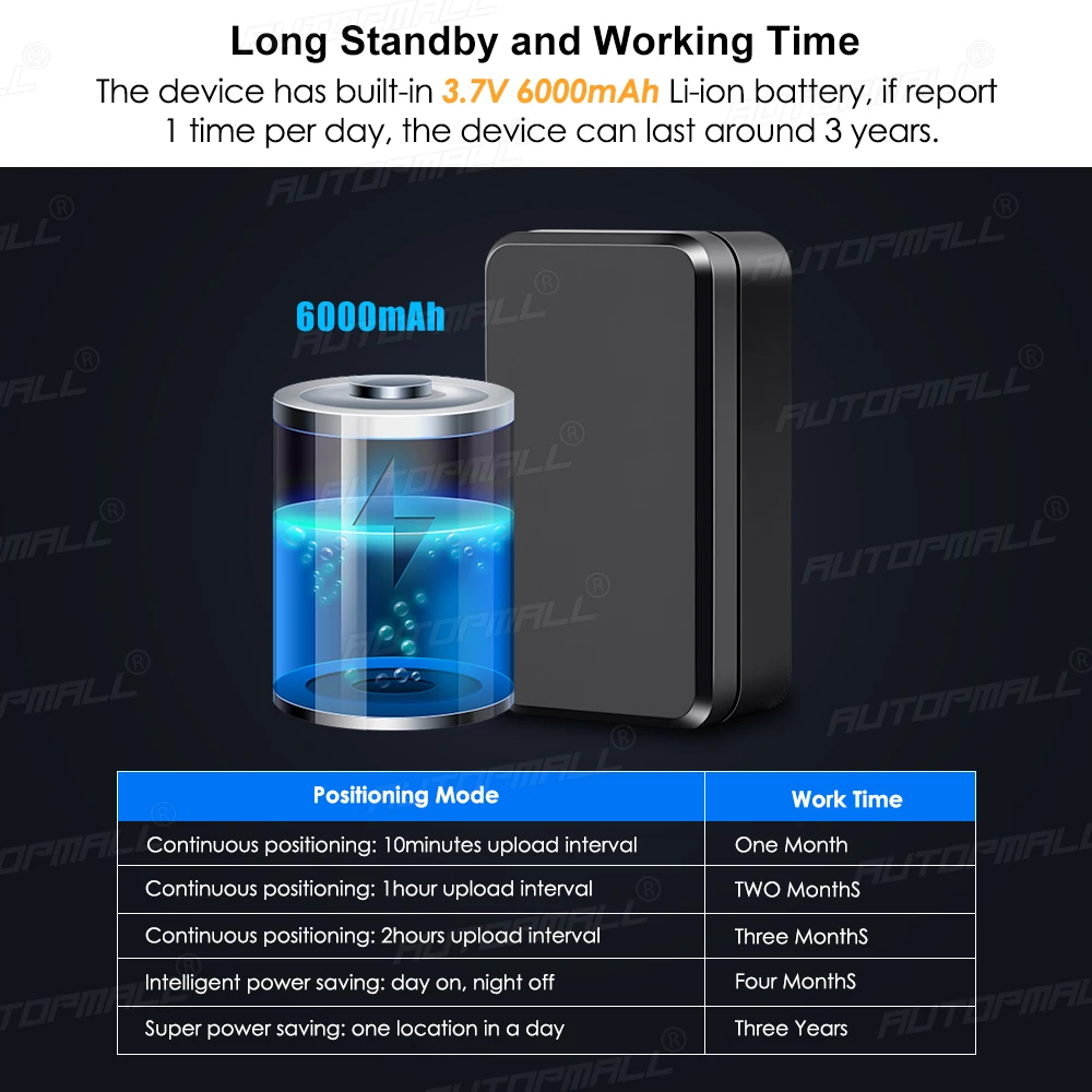 Устройство имеет встроенный 3,7 V 6000 мА/ч, литий-ионный аккумулятор, если отчет 1 раз в день, устройство может длиться около 3 лет.
