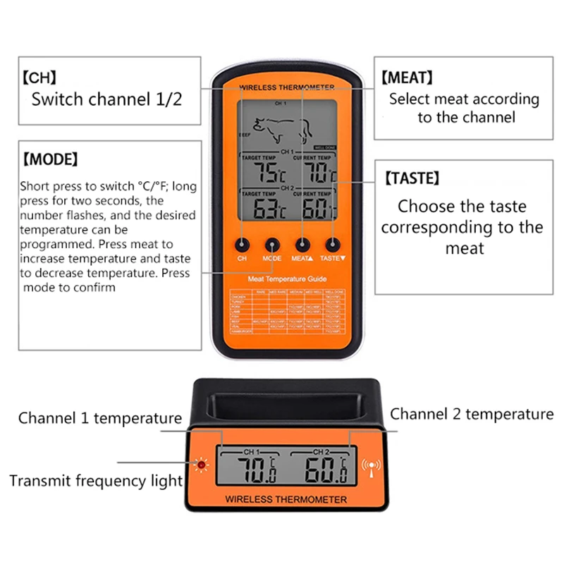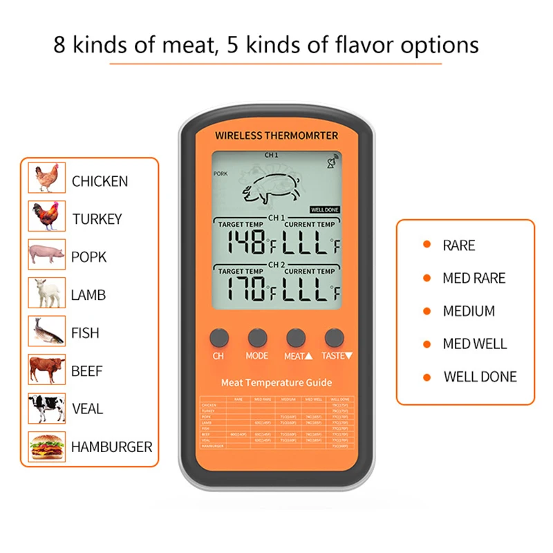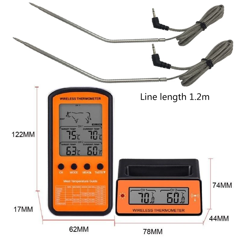 ** Простота в использовании: поставляется с 2 зондами из нержавеющей стали, вы можете следить за 2 различными продуктами одновременно.