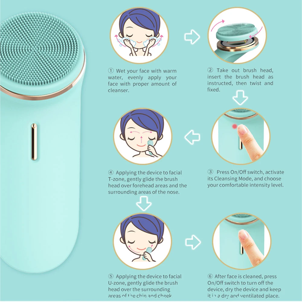 ★Эргономичный дизайн, силиконовый корпус: покрыт силикагелем, тонкий и шелковистый, простой в обращении. Почти одна тысяча щеток с дугообразным дизайном зубов, более комфортным для очищения кожи Технология Sonic Vibration: более деликатная на вашей коже, чем щетка для закручивания, мягко очищает и глубоко погружается в поры для удаления грязи, омертвевшей кожи, масла, остатков макияжа и черных точек, 6X более эффективно, чем ручное очищающее средство ★2 насадки для кистей: Φ = 0,06 мм щетина мягкая кисть для ухода предназначена для чувствительной и тонкой кожи, мягкая и удобная. Силиконовая насадка для мягкого отшелушивания и массажа, подходит для всех типов кожи ★5 режимов скорости и умный Таймер: 5 интенсивности от слабой до сильной, которые полностью настраиваются в соответствии с вашими потребностями. Функция интеллектуального таймера немного замедляется каждые 20 с, чтобы напоминать вам о смене зон, выключается через 5 минут-это гарантирует, что вы не перестанете делать очищение ★IPX 7 водонепроницаемый и Перезаряжаемый: с полностью водонепроницаемым дизайном IPX7, можно использовать в душе. Встроенный литиевый аккумулятор емкостью 300 мА · ч, может быть полностью заряжен за 1 час и длится более 30 дней для одного полного заряда
