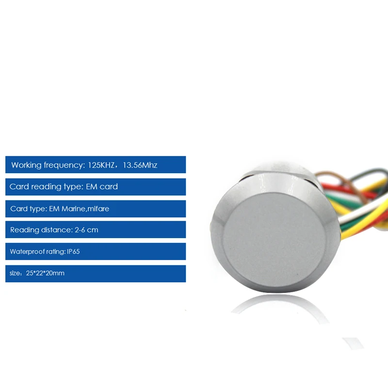 Характеристики:Карта Surpport: ID-карта EM или IC-карта MFРабочая частота: 125 кГц, 13,56 МГцРасстояние считывания: 2-6 смКласс водонепроницаемости: IP65Размер: 25*22 "20 мм
