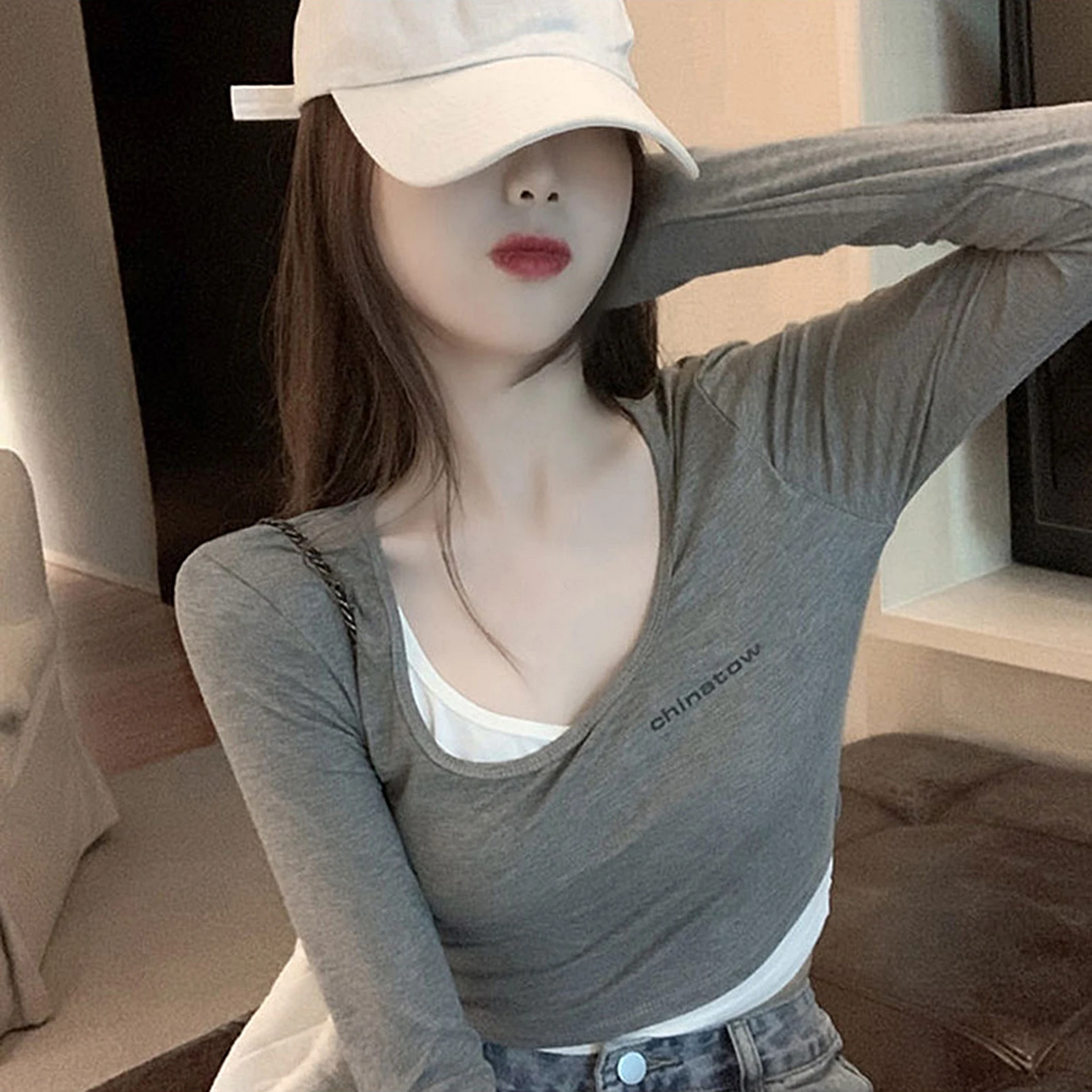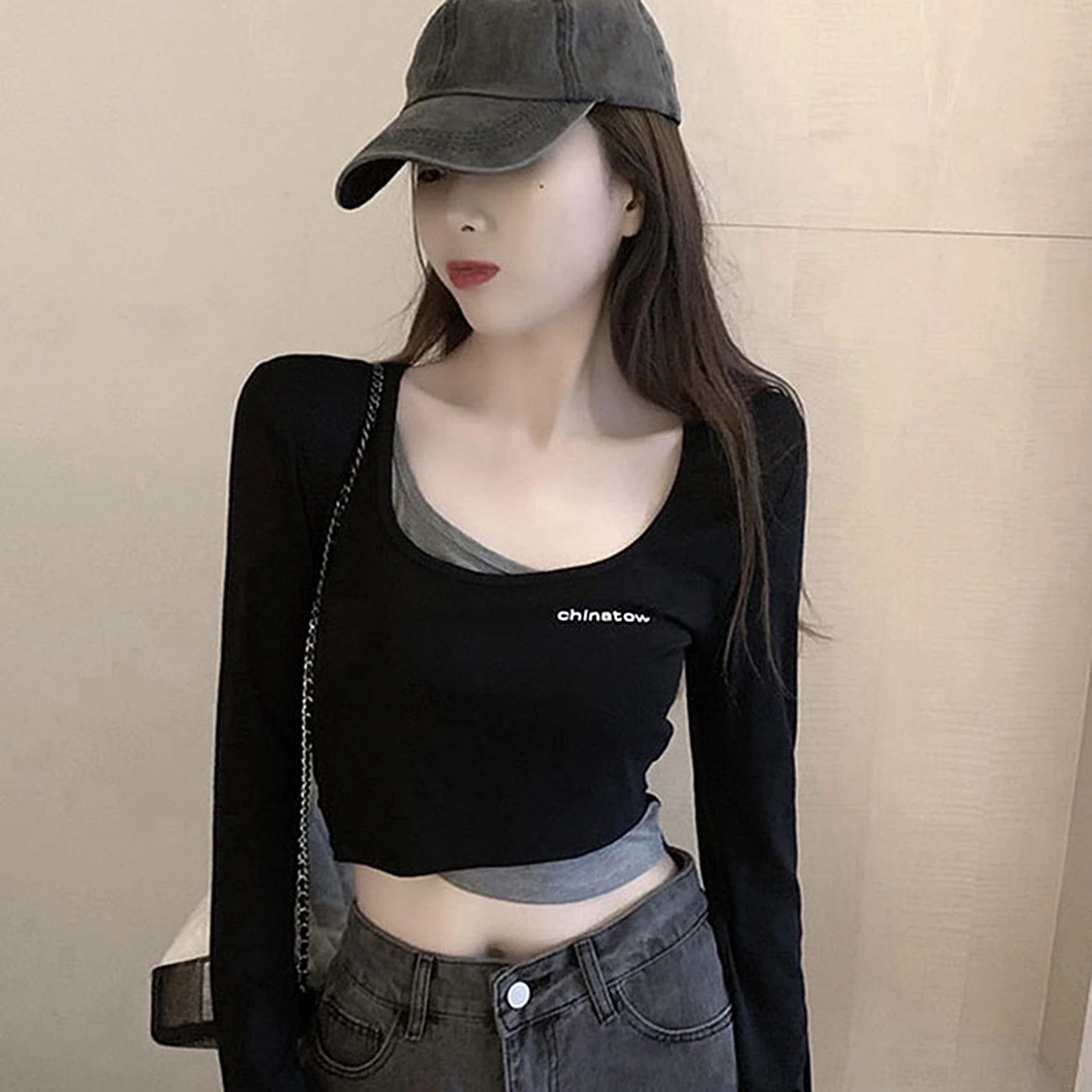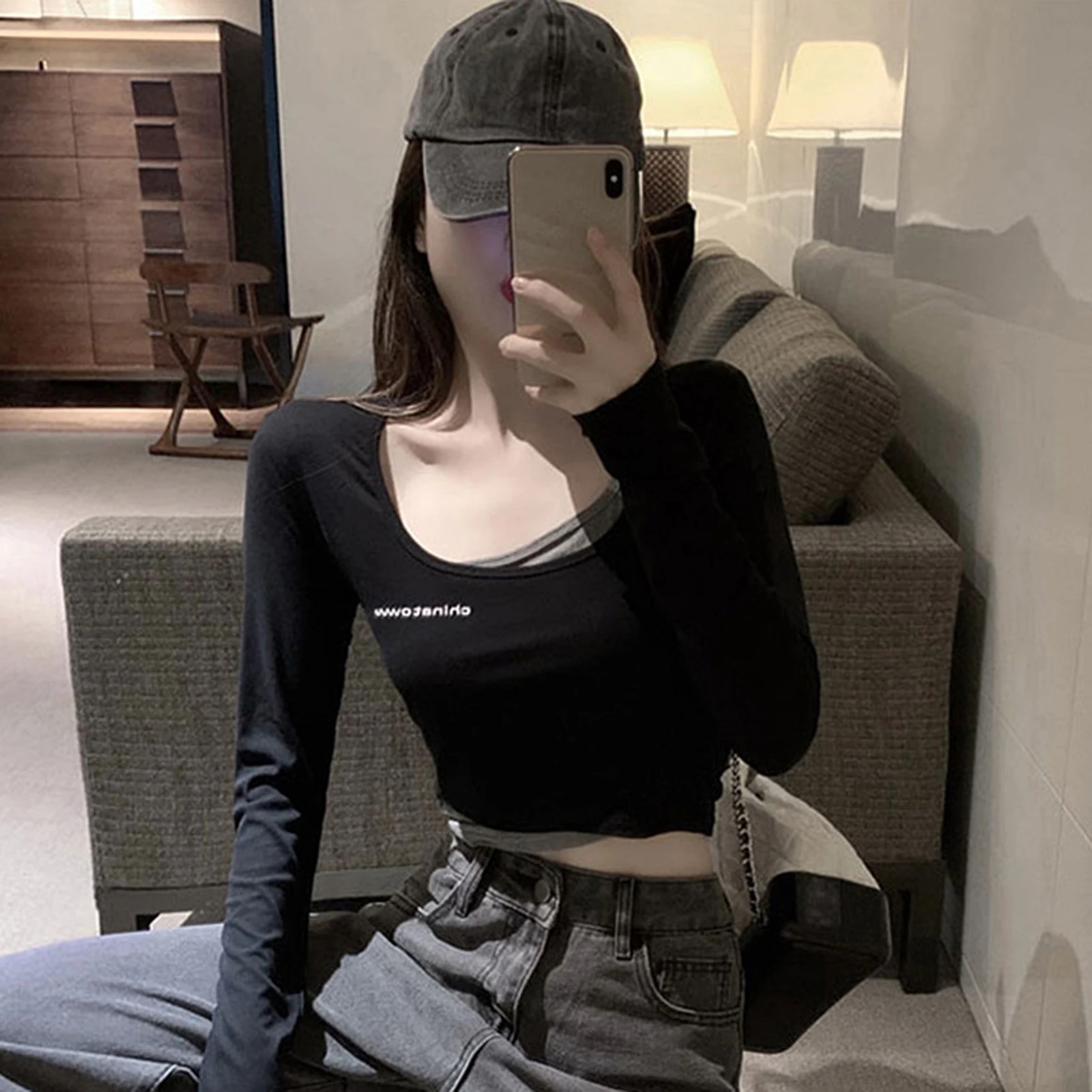 Женская шикарная блузка с длинным рукавом и буквенным принтом из двух частей, приталенная блузка, укороченный топ