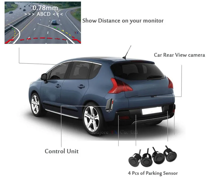 1. Показывайте изображение заднего вида и расстояние на мониторе одновременно, если вы подключаетесь к экрану и камере заднего вида вместе2. Безопаснее при парковке3. Этот датчик парковки также предупредит вас черезДинамик bibiТак как расстояние составляет 1,5 м.Особенности:Двухъядерный процессорДатчик изображения: CCD 7070 (отображение разметки расстояния)
