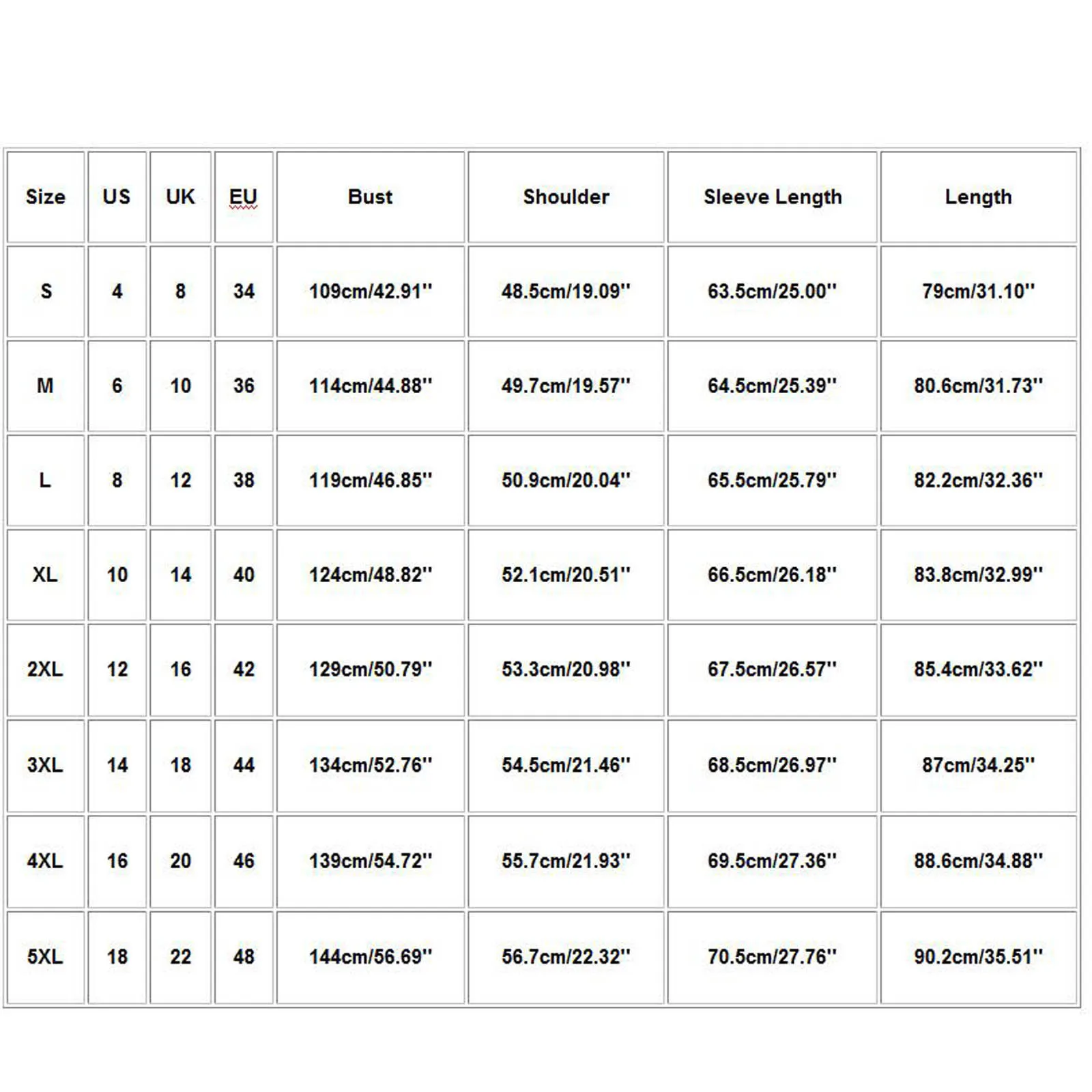 Размер США Великобритания ЕС Бюст Плечо Длина рукава Длина S 4 8 34 109 см/42,91'' 48,5 см/19,09'' 63,5 см/25,00'' 79 см/31,10'' М 6 10 36 114 см/44,88'' 49,7 см/19,57'' 64,5 см/25,39'' 80,6 см/31,73'' L 8 12 38 119 см/46,85'' 50,9 см/20,04'' 65,5 см/25,79'' 82,2 см/32,36'' XL 10 14 40 124 см/48,82'' 52,1 см/20,51'' 66,5 см/26,18'' 83,8 см/32,99'' 2XL 12 16 42 129 см/50,79'' 53,3 см/20,98'' 67,5 см/26,57'' 85,4 см/33,62'' 3XL 14 18 44 134 см/52,76'' 54,5 см/21,46'' 68,5 см/26,97'' 87 см/34,25'' 4XL 16 20 46 139 см/54,72'' 55,7 см/21,93'' 69,5 см/27,36'' 88,6 см/34,88'' 5XL 18 22 48 144 см/56,69'' 56,7 см/22,32'' 70,5 см/27,76'' 90,2 см/35,51''