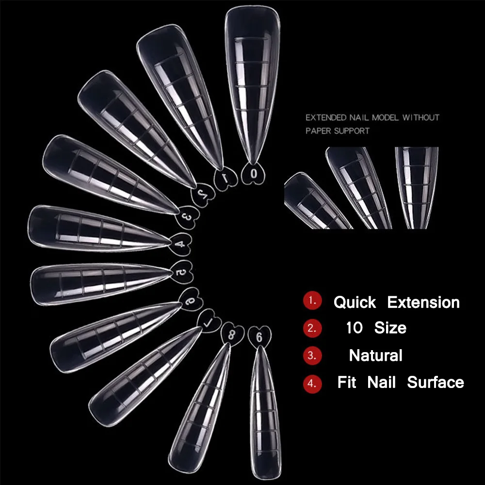 10 различных размеров: 100 шт. форм для ногтей на шпильках предлагает 10 различных размеров и с ясным масштабом с 10 гвоздями каждого размера, которые подходят для большинства пальцев, которые индивидуально пронумерованы 0-9, таким образом, они легко и удобно выбирать подходящий размер, чтобы удовлетворить потребности ваших более широких ногтей.