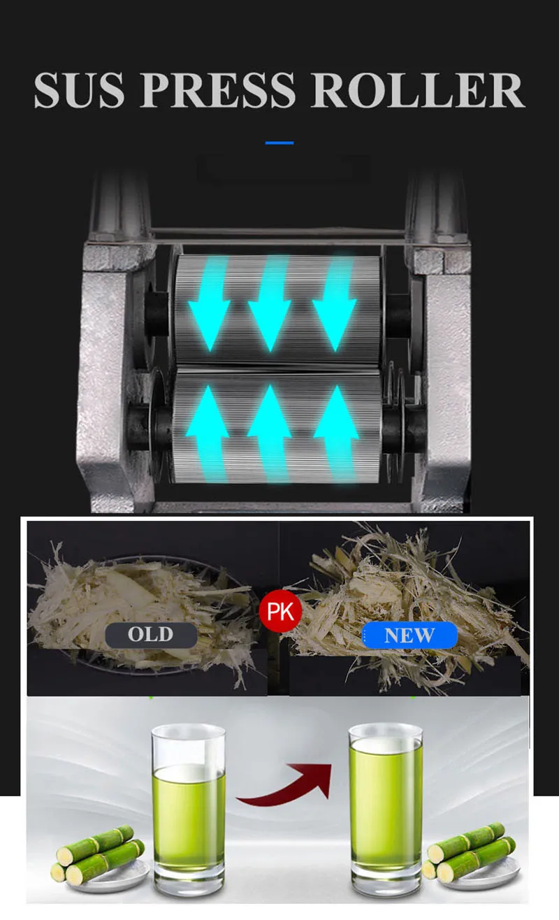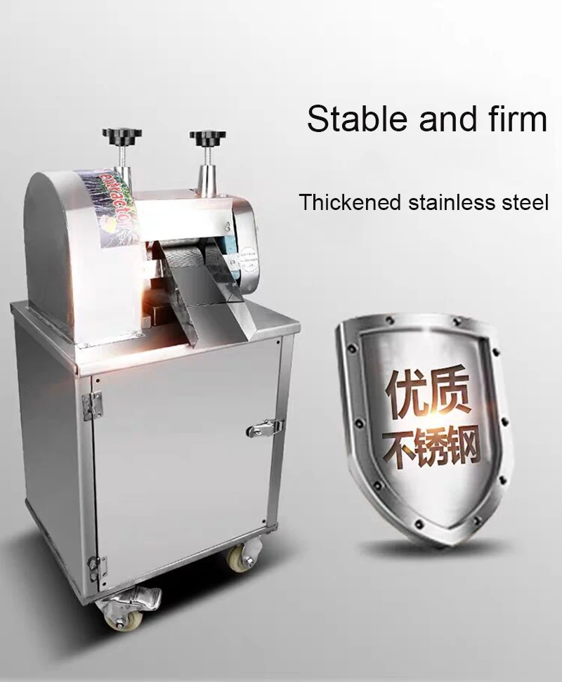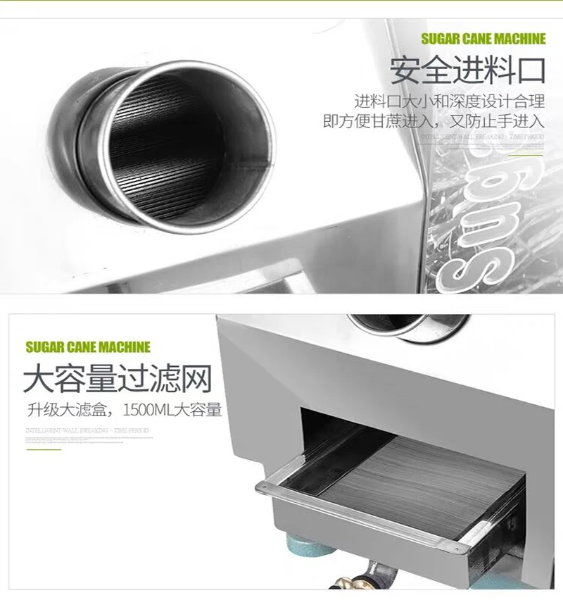 The main components of the sugarcane juicer are made of stainless steel, which is hygienic and easy to operate. The juice squeezed by this machine belongs to the original natural green beverage, sweet and refreshing, and rich in nutrition. It is suitable for freshly squeezed drinks in hotels, fruit shops, cold drinks shops, schools, parks and other places.