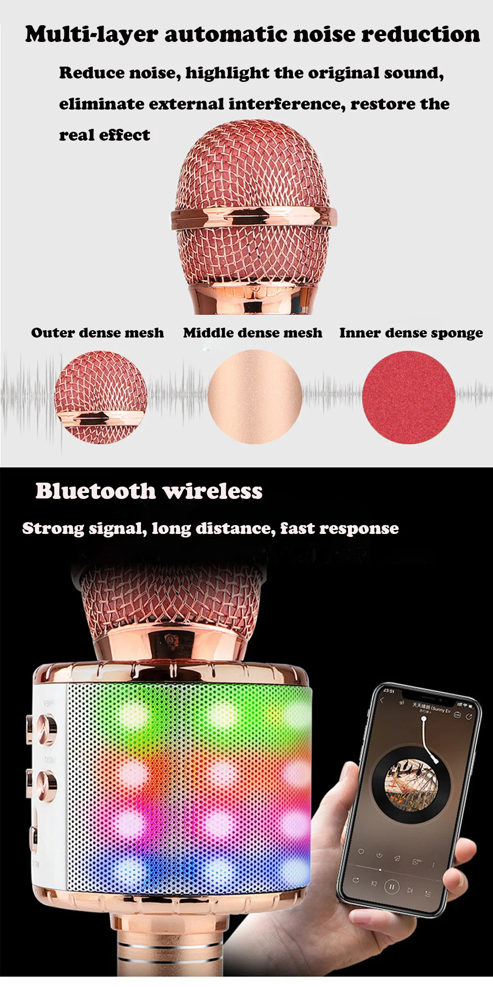 1. Bluetooth беспроводной микрофон и динамик комбо, работает одновременно 2. Трехслойный автоматический дизайн шумоподавления, восстановление реального звука, караоке 3. Поддержка функции TF, plug and play, с выключением питания воспроизведения 4. Многофункциональная панель регулировки, богатые и разнообразные функции