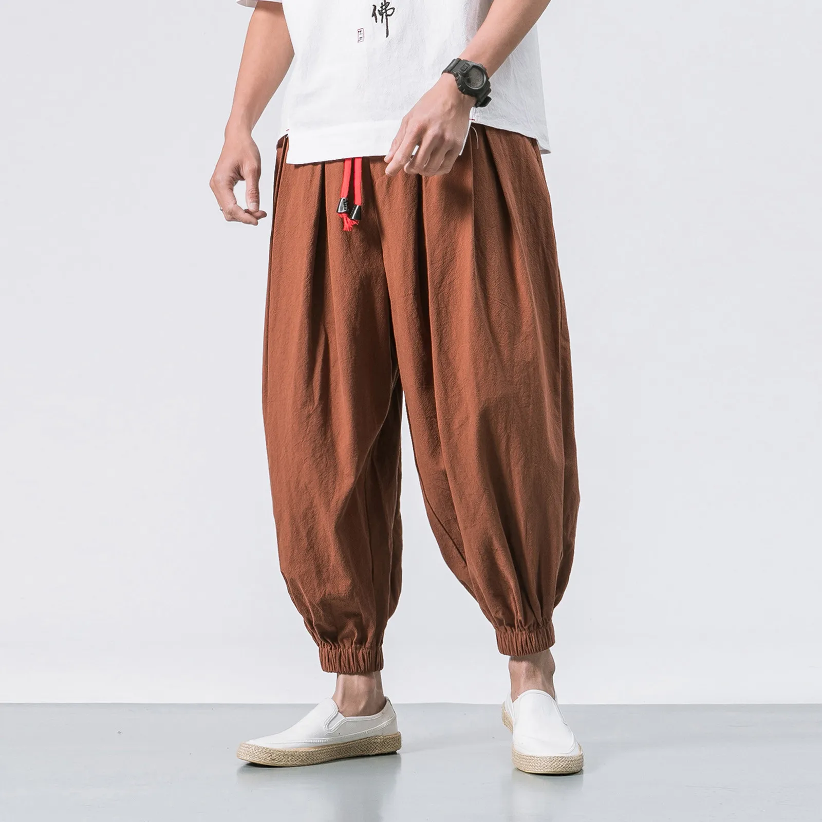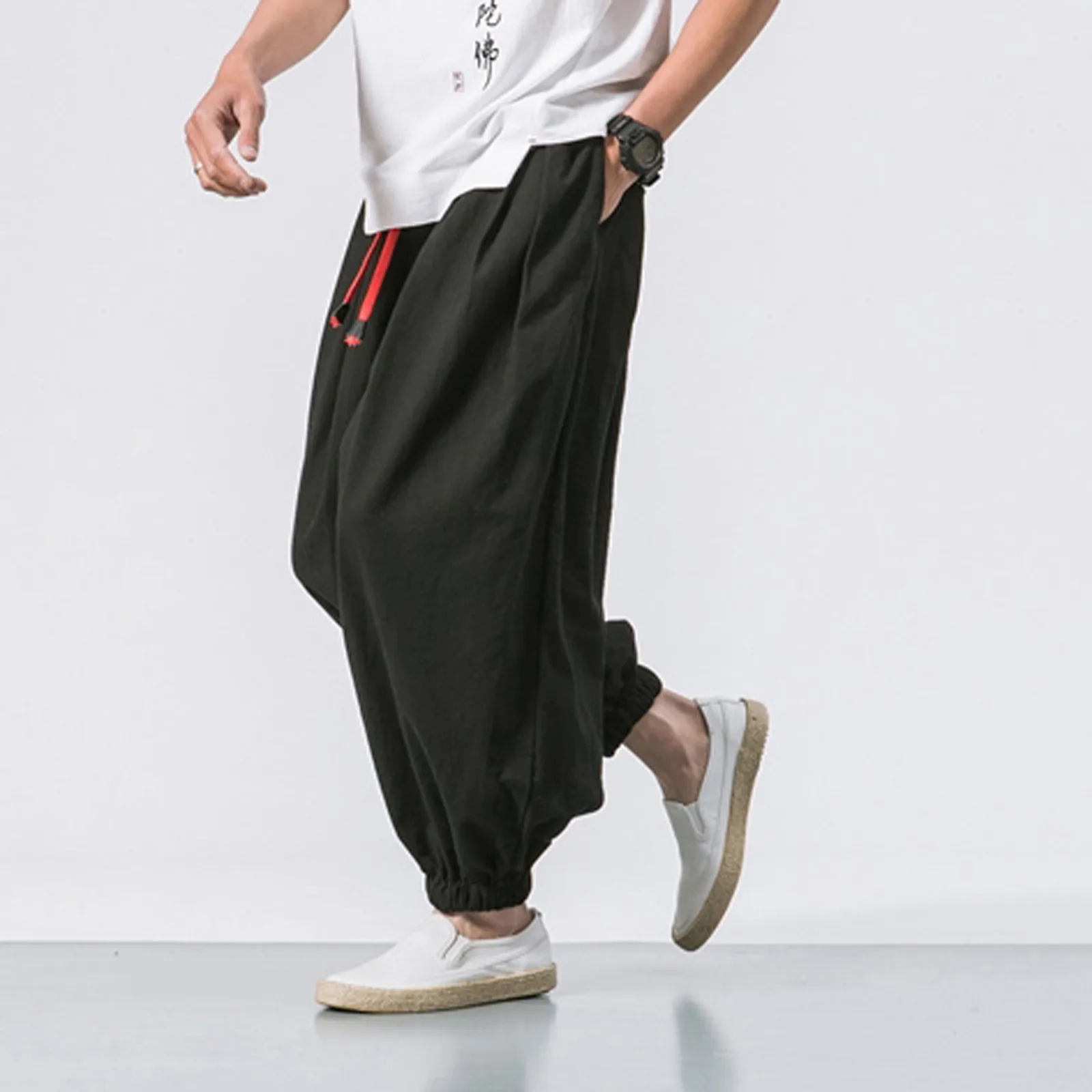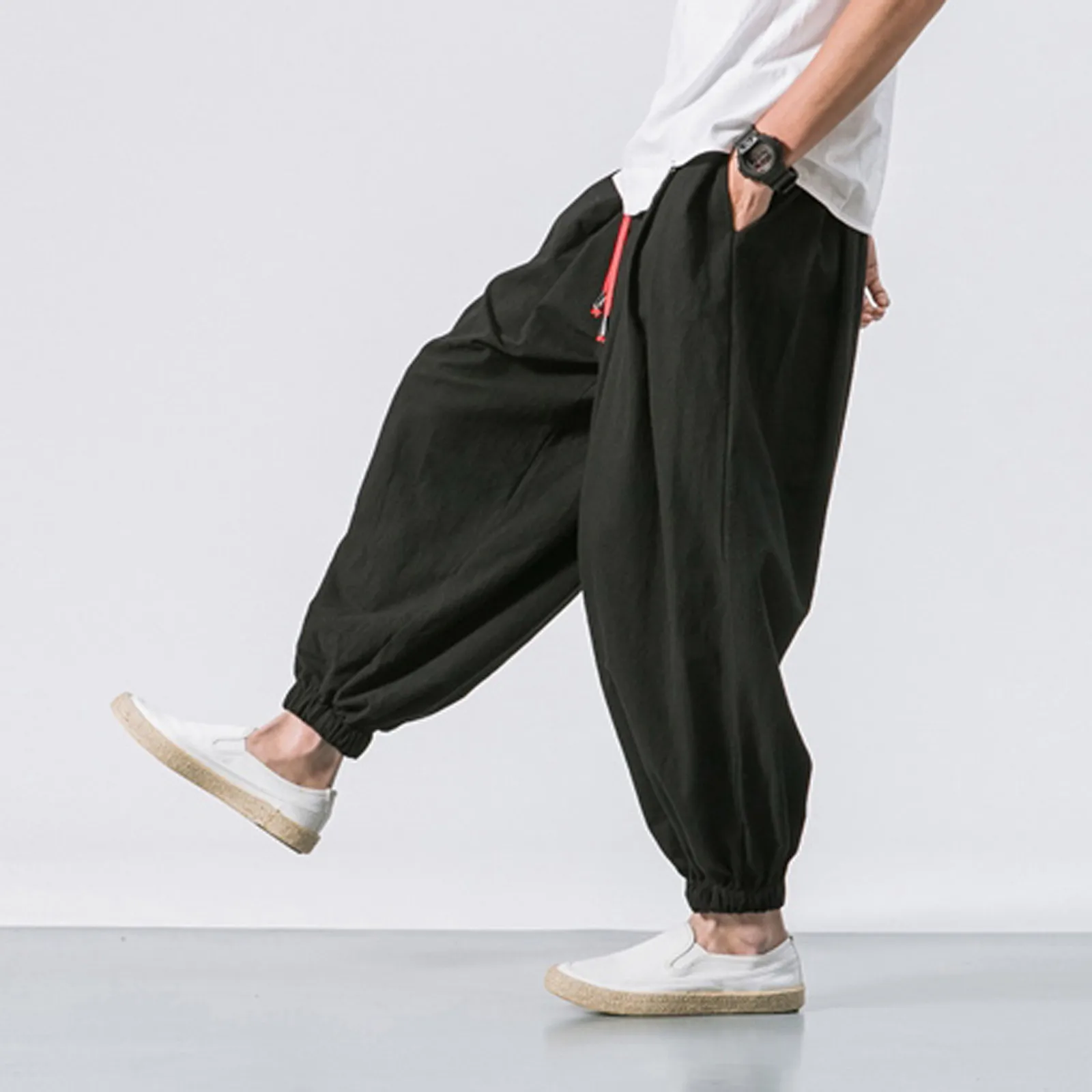 Мужские модные повседневные свободные однотонные шаровары, широкие эластичные штаны