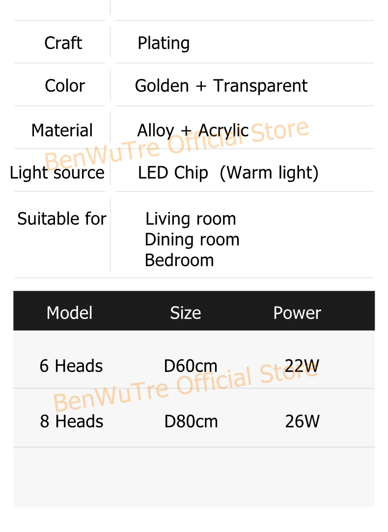 Корпус светильника: золотистый + прозрачный Материал: металл + акрил Источник светильник: светодиодный чип (теплсветильник) Подходит для: гостиной, столовой, спальни Размер: d60см (22вт), d80см (26Вт) Регулируемая подвесная линия