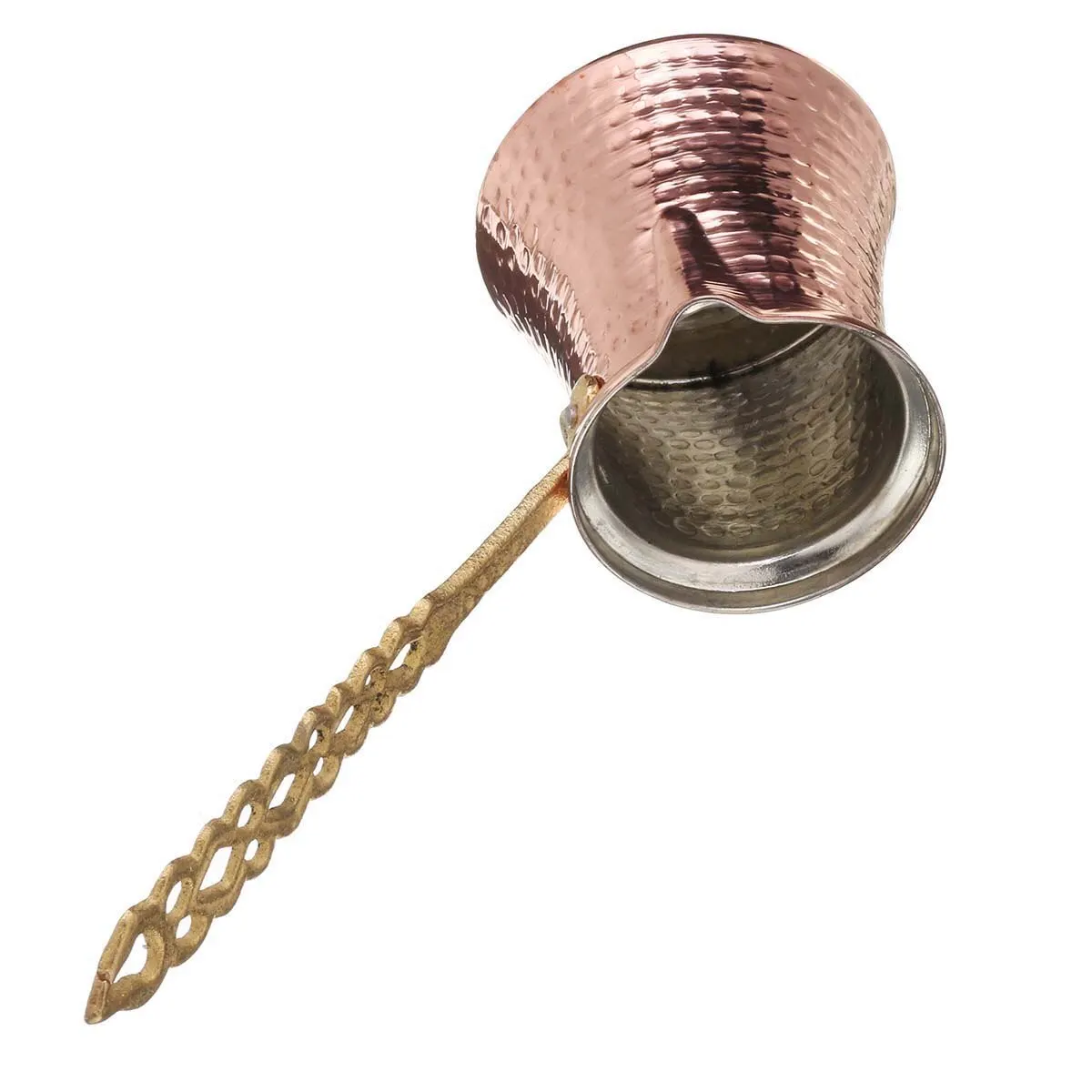 Медная турка из страны, подарившей нам это слово. Ручная чеканка, металлическая ручка, более тонкие (по сравнению с отечественными и индийскими образцами) стенки. Классическая технология производства, практически не изменившаяся за последние 400 лет.