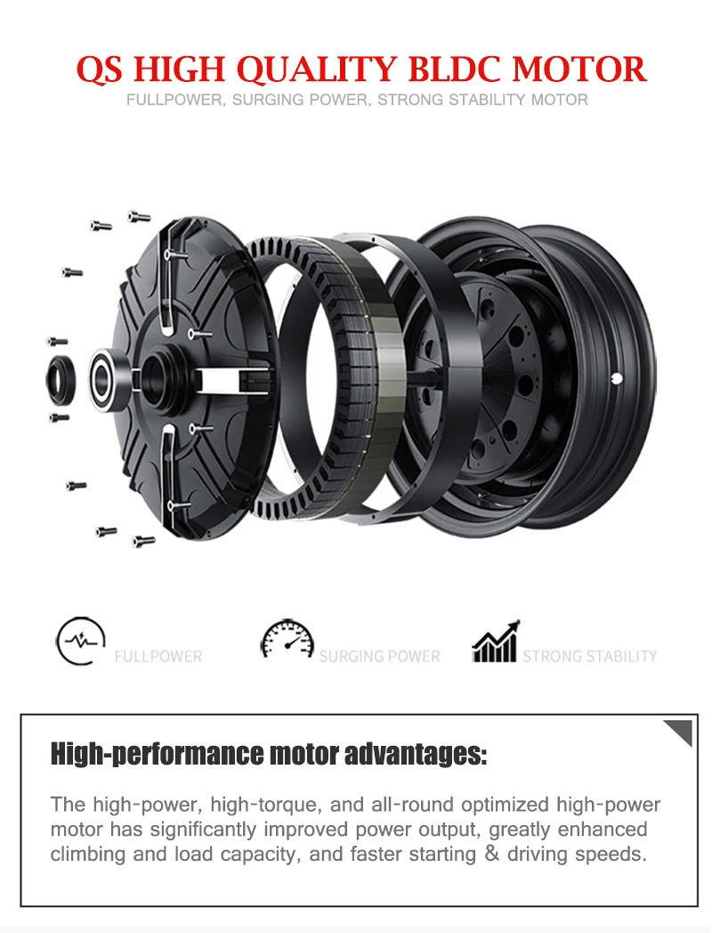 Тип двигателя: внешний ротор BLDC, мотор-концентратор с датчиком Холла Бренд: QS Motor, QSMOTOR Конструкция двигателя: одноосный без обода мопеда (интегрированный) Подходящий размер обода:14 дюймов и выше обода колеса, CB ≥ 60 мм, PCD ≤ 110 мм(PCD 4*100 мм, cb60 мм по умолчанию) Высота магнита: 45 мм, 28 пар полюсов Статор: алюминиевый сердечник Номинальная мощность: 6000 Вт Скорость: 24KPH-100KPH, он настроен, genearlly мы проектируем как 72V70KPH. Диапазон рабочего напряжения: 48-144 в, будет 72 в по умолчанию. Максимальный крутящий момент около 286.0N. Термический зонд: KTY83-122 (по умолчанию, опционально) Максимальная эффективность около 84% Рабочая температура: 70-120 ℃, Пик 150 ℃ Тип тормоза: дисковый тормоз (по умолчанию), PCD: 3*80 мм, M8 Два зала с водонепроницаемыми соединителями (один для использования, один для запасных Балетки 12 мм 16 мм ² поперечное сечение фазового провода (не включая изоляционный слой) Класс водонепроницаемости: IP54 Цвет: черный (по умолчанию) Вес нетто/вес брутто: 21,5 кг/23,0 кг
