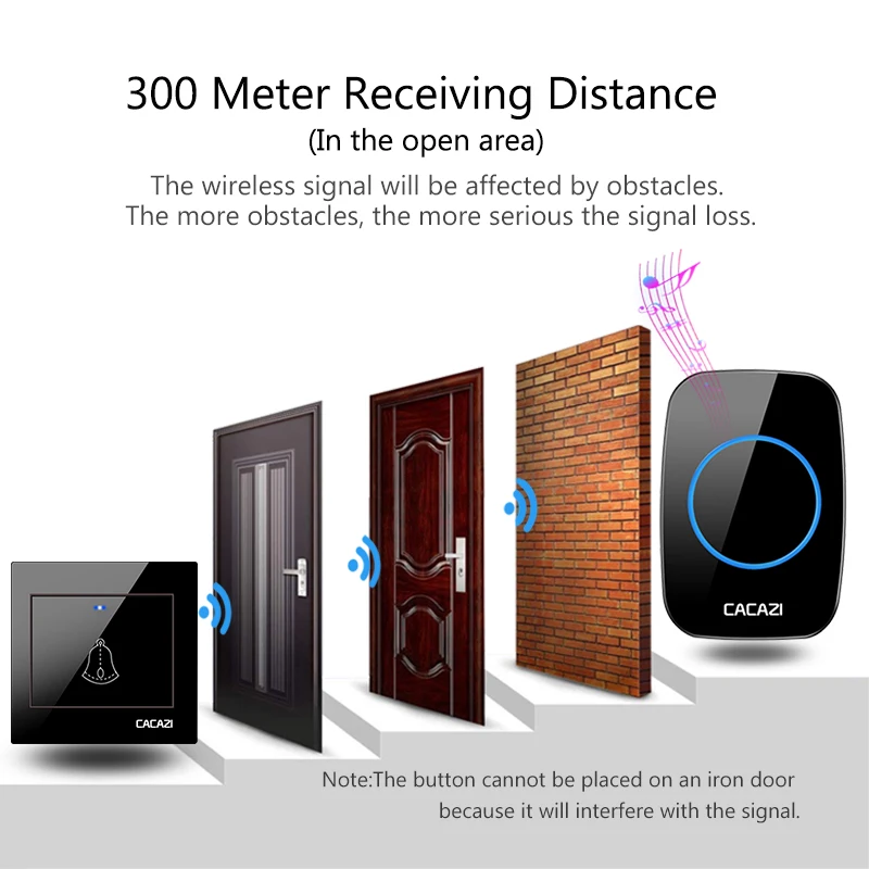 1. Расстояние приема может зависеть от окружающей среды или препятствий 2. Кнопка не может быть размещена на железной двери, которая защитит сигнал. Рекомендуется разместить кнопку рядом с железной дверью. 3. Кроме того, приемник не должен быть помещен возле микроволновой печи или радио, что будет мешать сигналу.