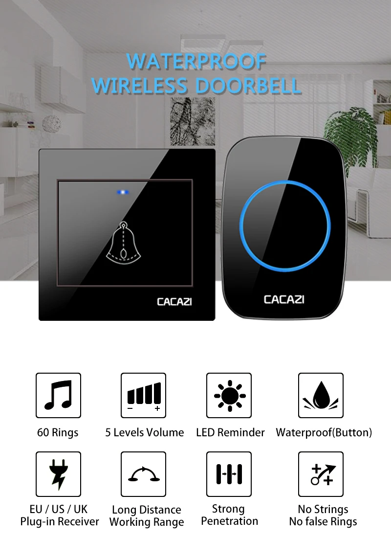 CACAZI водонепроницаемый беспроводной дверной звонок 60 колокольчиков 5 громкость для дома беспроводной дверной звонок AC US EU UK вилка 1 2 кнопки 1 2 3 приемник