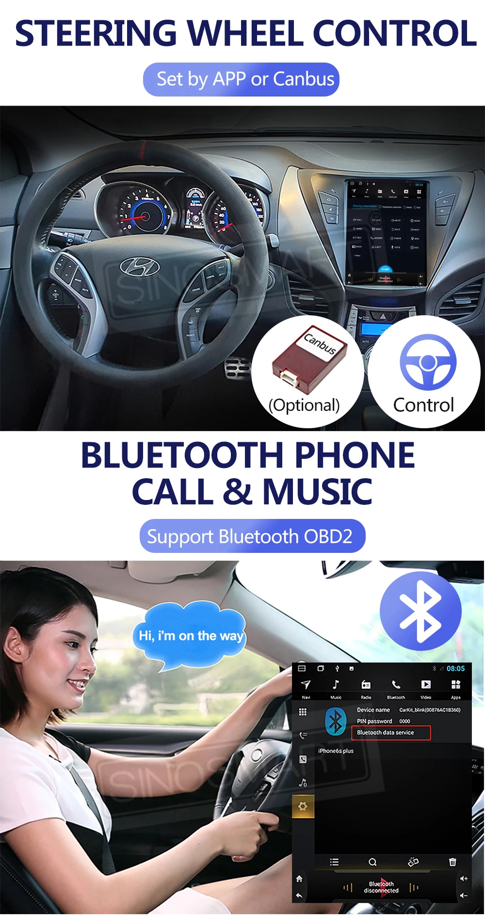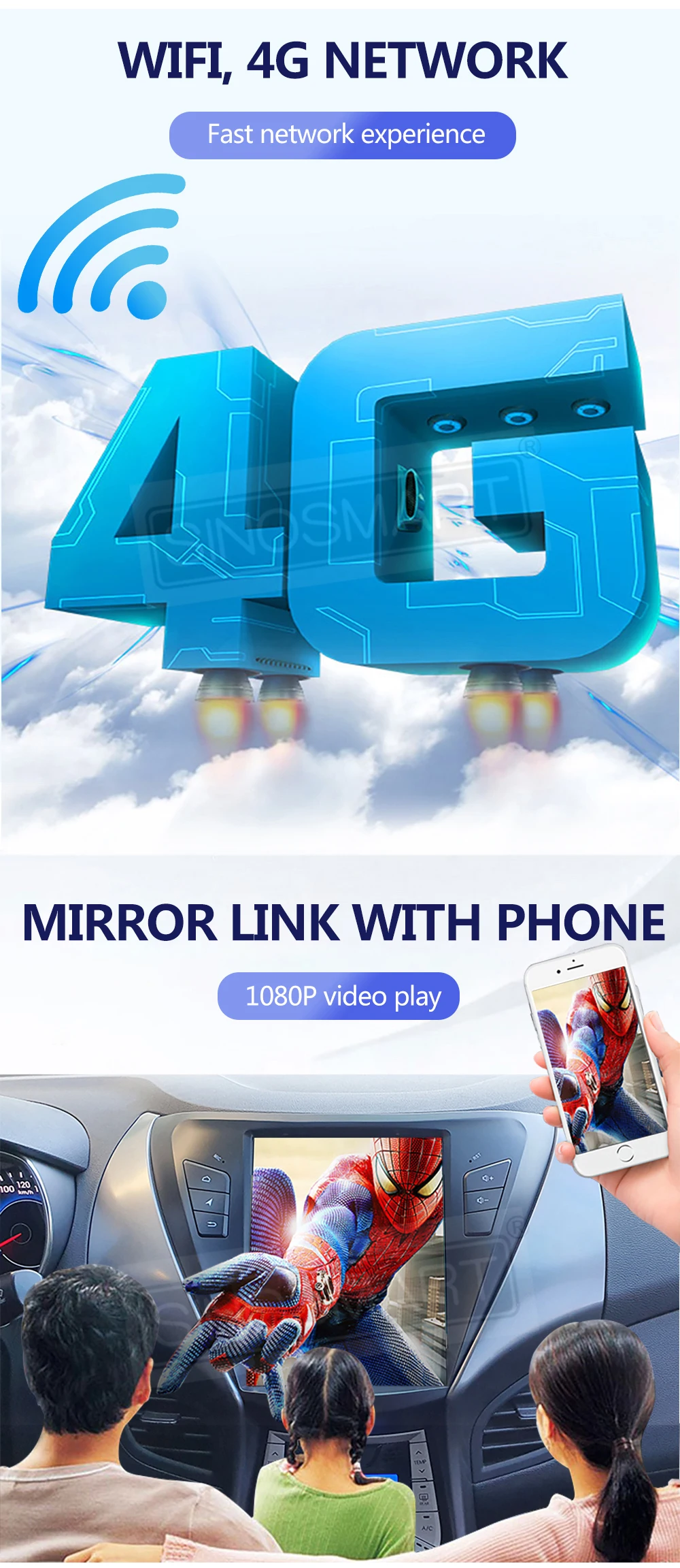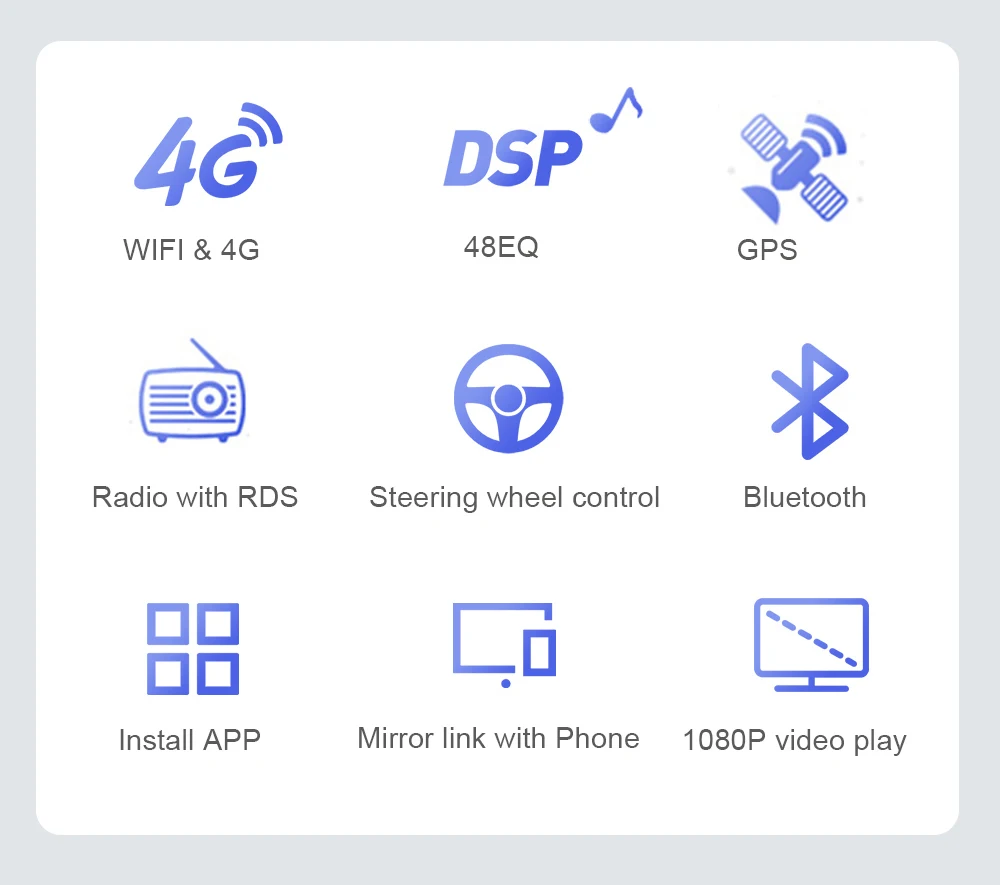 Встроенный WIFI/4G сеть, GPS, радио с RDS, поддержка кнопок управления рулем, Bluetooth для телефонных звонков/музыки и Bluetooth OBD, 1080P видео воспроизведения, зеркальная связь с телефоном. Загрузите и установите приложение, которое вам нравится.