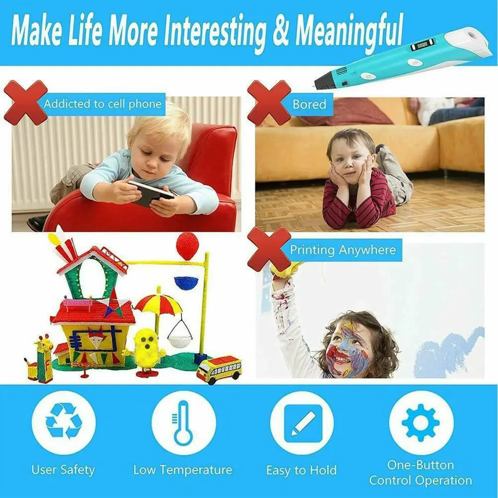 1.3D ручка Помогает детям улучшить пространственное мышление, творческие способности и художественные навыки, позволяет взрослым дышать от рабочей нагрузки. Отлично подходит для семейного времени. 2. Также как практичный инструмент, его можно использовать для создания подарка ручной работы для друзей или украшения для вашего дома, или для фиксации изношенных кабелей, или для улучшения кухонного крючка.