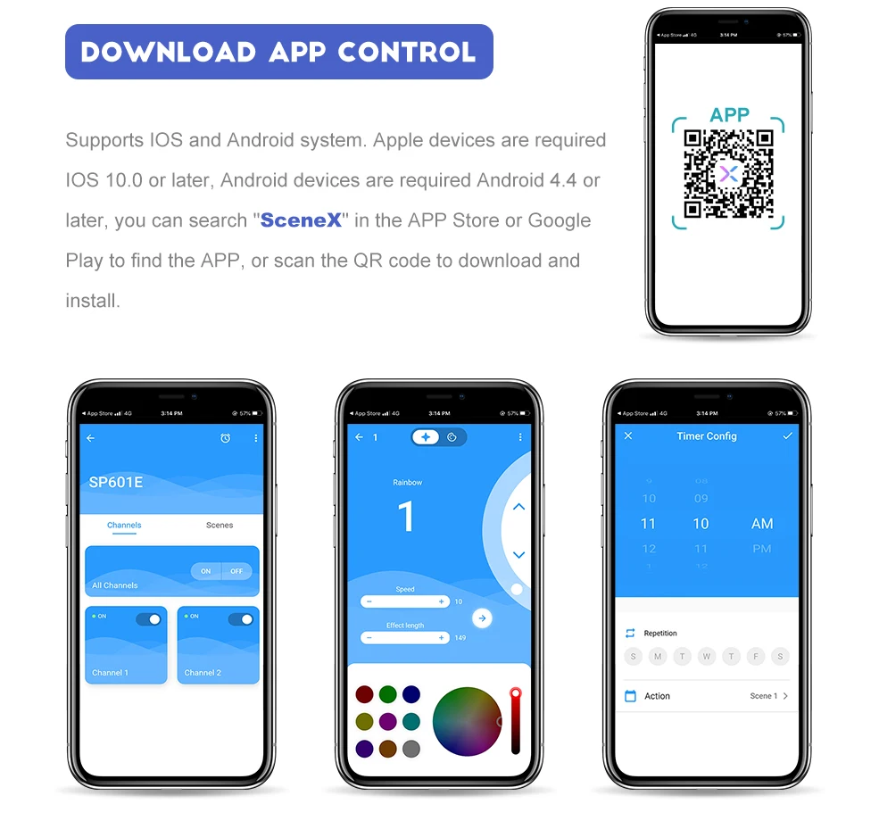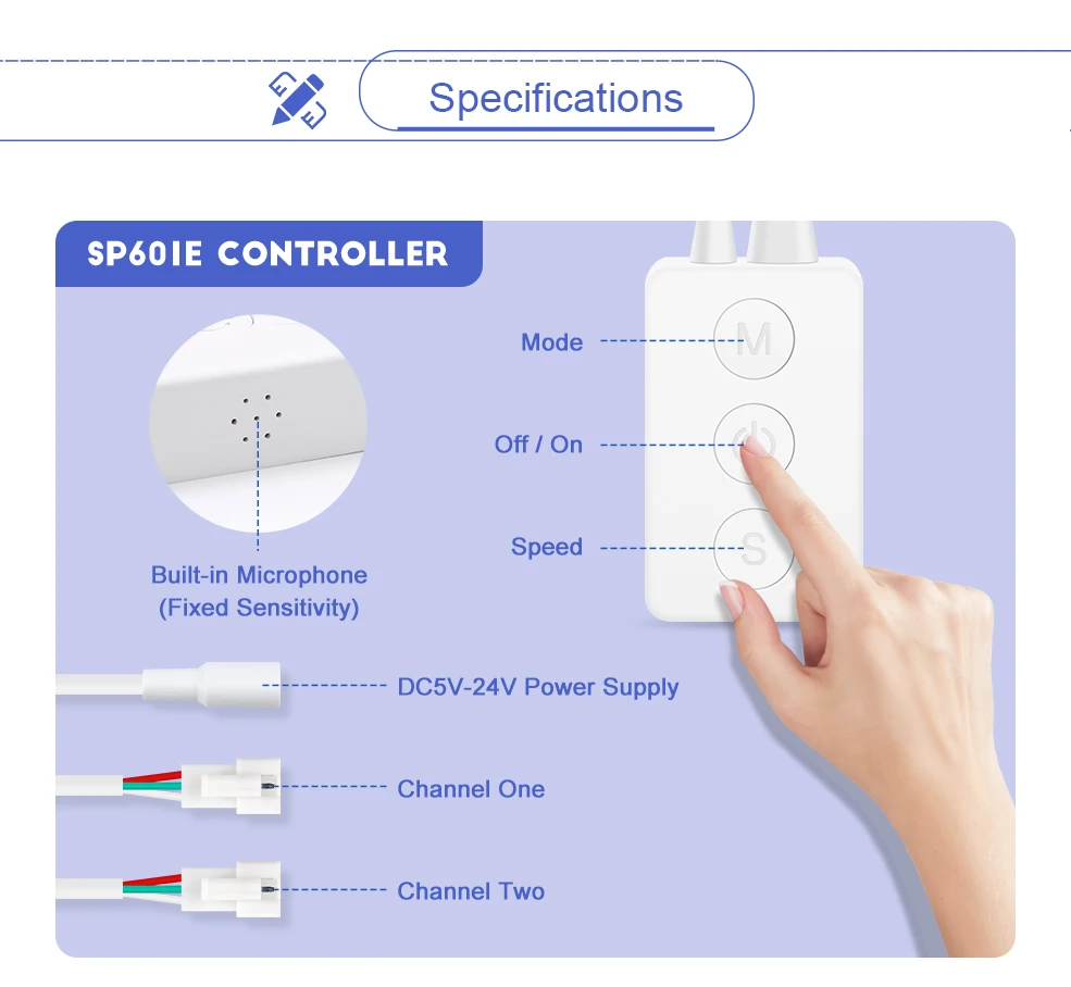 Входное напряжение: DC5-24VУслуги осветительных решений: дизайн освещения и схемТип: приложение Bluetooth или пульт дистанционного управленияУправляемые пиксели:SP107E1 шт. (960 пикселей/порт);SP601E/SP608E2 шт/8 шт (600 пикселей/порт)Применение: цифровой светодиодный светильникРежим подключения: умное приложение или пульт дистанционного управленияВыходной сигнал: цифровой сигнал SPI (TTL)Поддержка: IOS 10,0/Android 4,4Приложение:SP107EИспользование"Светодиодный Chord";SP601E,SP608EИспользование"SceneX"
