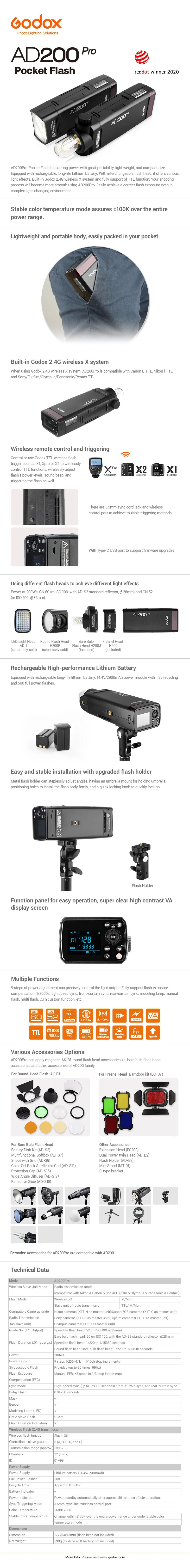 AD200ProВторое поколение этого гладкого и универсального стробоскопа, AD200Pro имеет ряд усовершенствований по сравнению с его предыдущей:Специальный Стабильный режим цветовой температуры, который улучшает цветовую консистенцию в пределах +/- 100K во всем диапазоне мощности