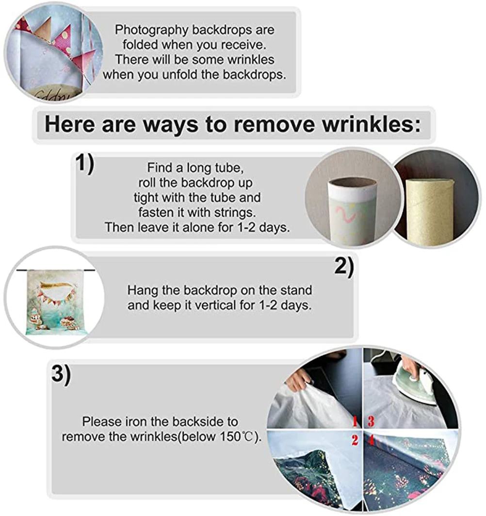 (1) плотно закатайте его цилиндром в течение 3-4 дней, все будет в порядке. (2) Нагрейте его паровым утюгом на задней части изделия, при необходимости, пожалуйста, прогладьте заднюю поверхность паровым утюгом, но не сухим утюгом. Затем он снова будет гладким.