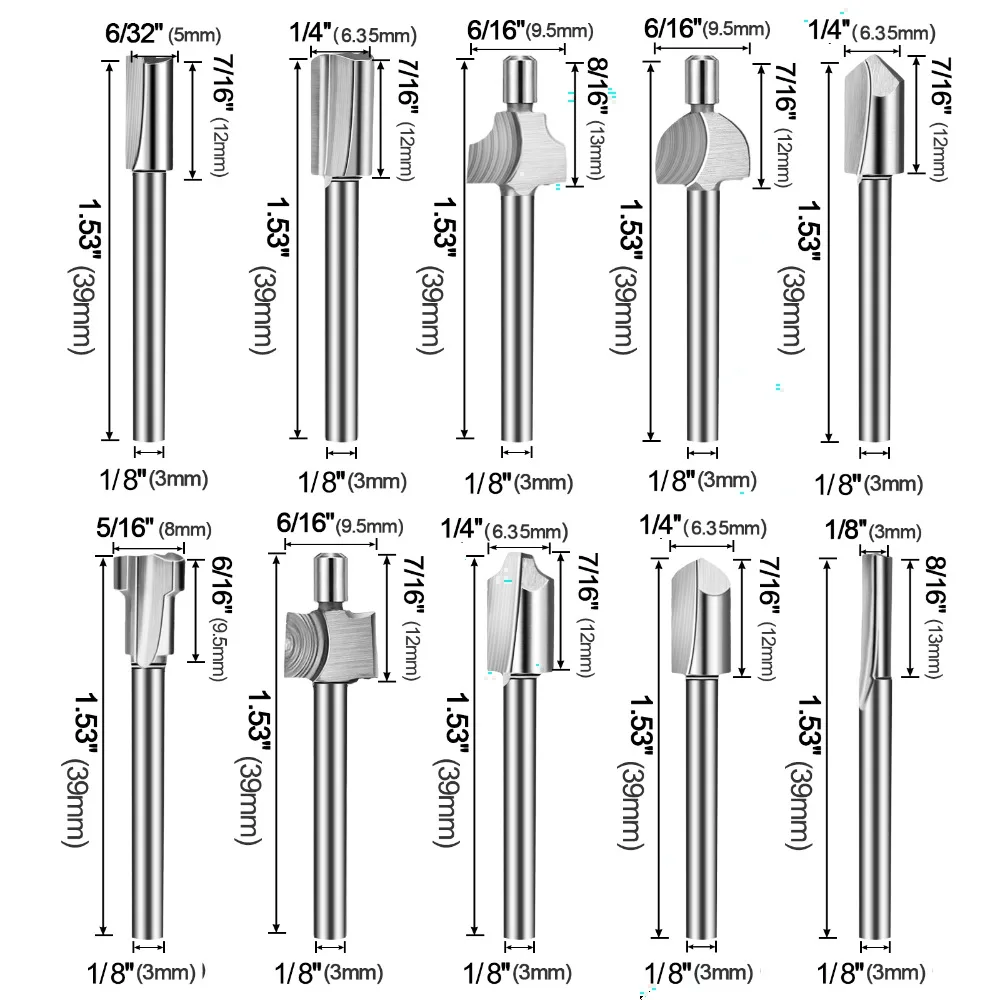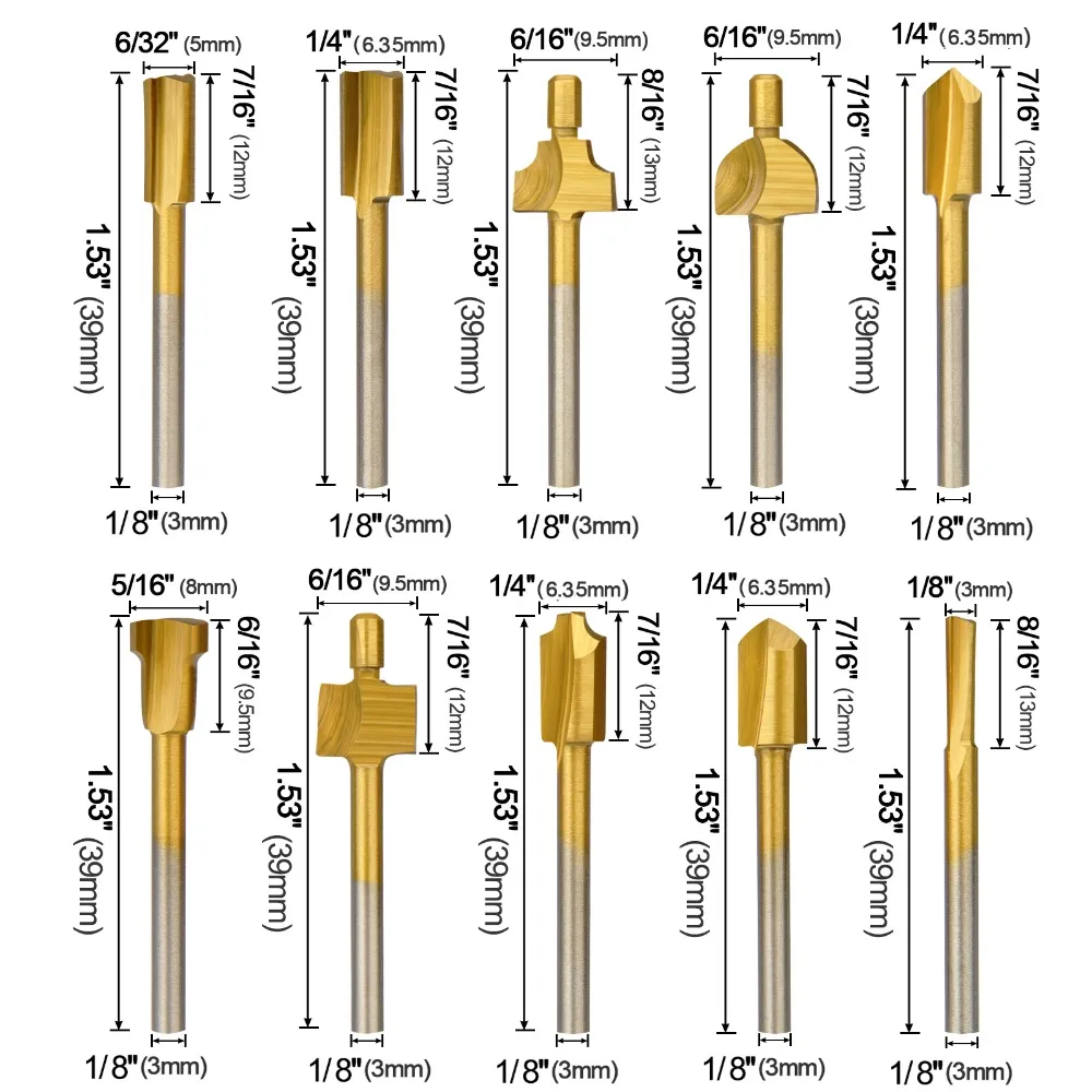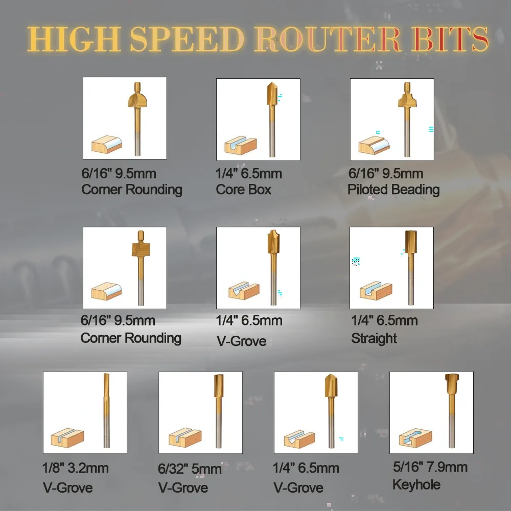 2. 10 шт. фасонные фрезы HSS: 10 различных частей наиболее часто используемых типов фрез, включая прямой, обрезной, v-образной паз, бисероплетение, бухту, резак слотов и многое другое, отличный набор гравировальных бит для удовлетворения ваших различных потребностей.