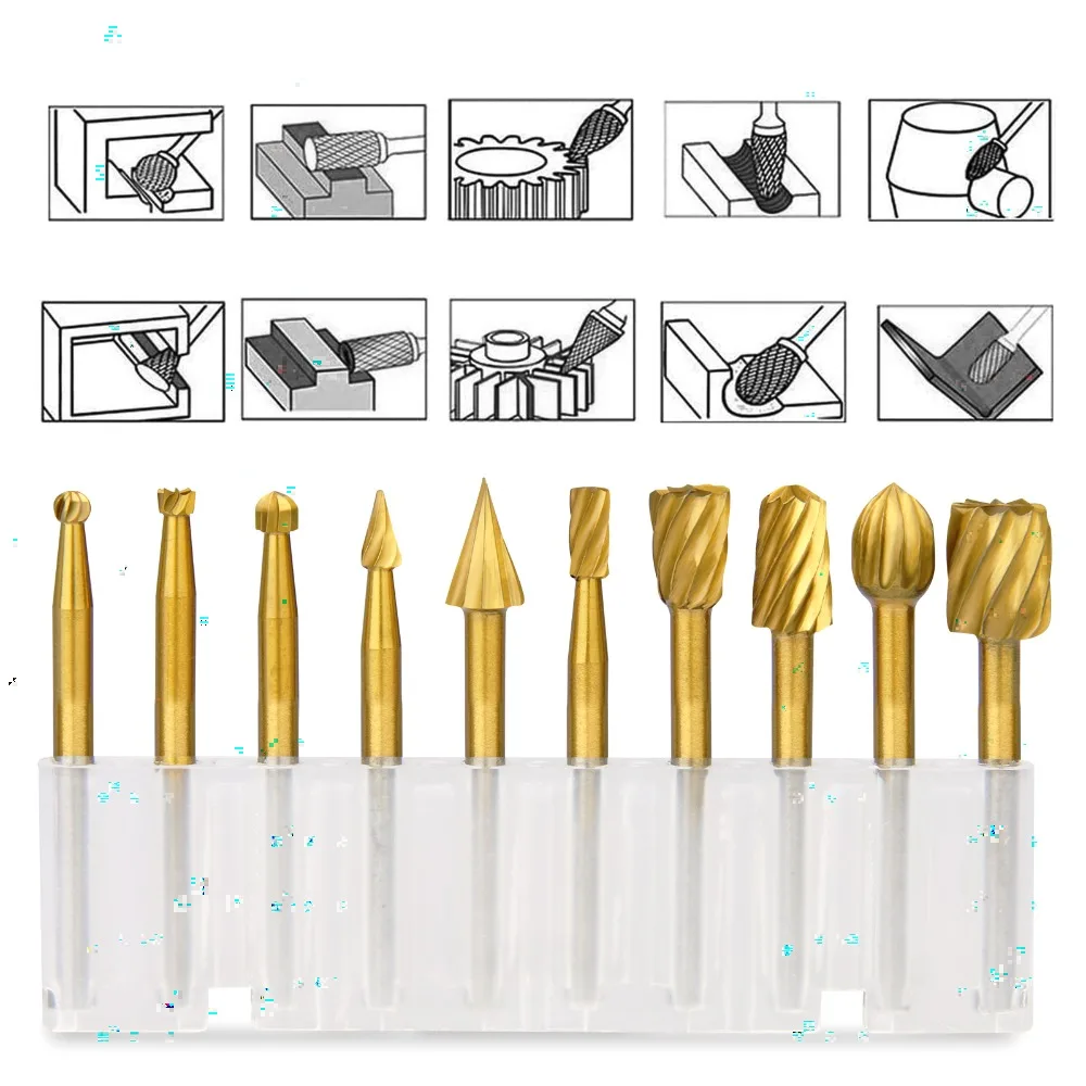 3. 10 шт. вращающихся бит: 10 различных заусенцев в одном наборе, каждый заусенец имеет форму для различных углов или ситуаций, подходит для гравировки, скошенности, снятия фаски, обработки канавок, перемотки, полых.