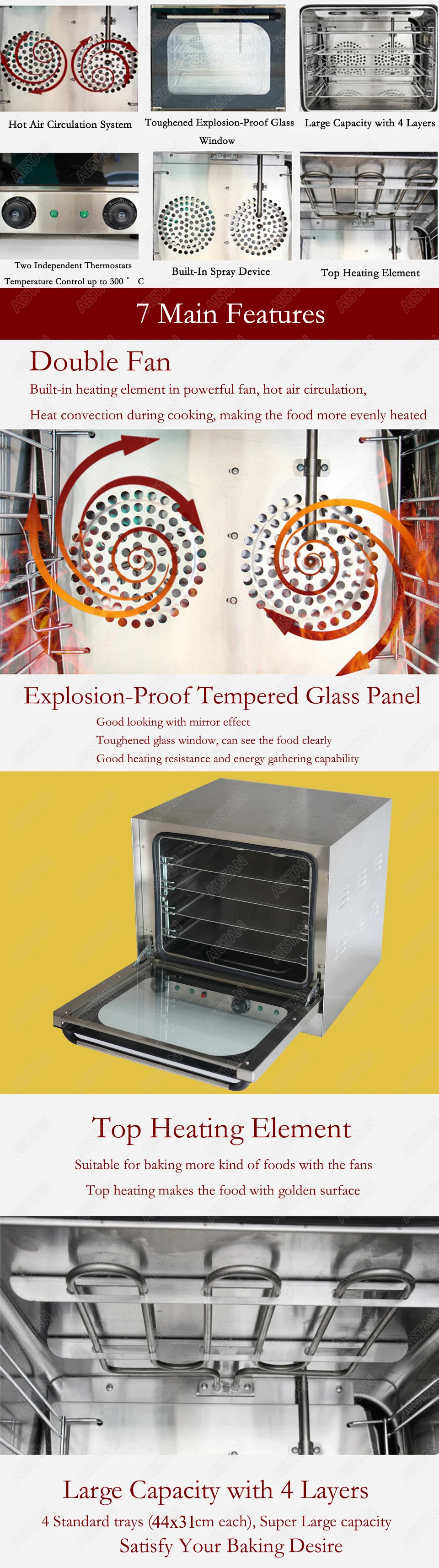 The machine is an electric stainless steel electric oven, which has a four-layer baking tray to increase the amount of baking, and is freely controlled from 0 to 300 °C. There is also a hot air circulation device to prevent baking. The machine is suitable for baking egg tarts, cakes, breads, pizzas and other ingredients.