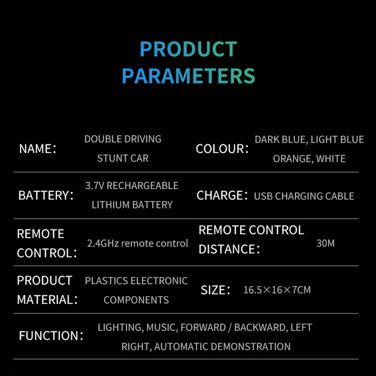 Долгое время работы в режиме воспроизведения: дистанционный пульт stunt автомобилей использует 3,7 V Перезаряжаемая батарея 400 мАч (в комплекте) с usb-кабелем (в комплекте), стоимость 2 Время зарядки в течение 20 минут. С a Дальность более 30 метров, вы можете взять его для езды.