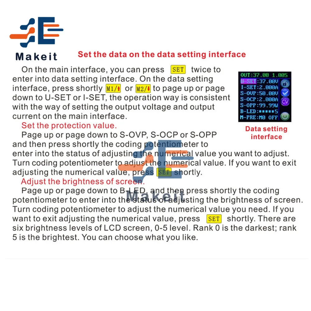 DP20V2A Описание: 1. Информация о продукте Постоянное напряжение и постоянный ток программируемый контроль модуля питания небольшой и изысканный, и интегрирует аналоговые и цифровые функции управления в одном. Его регулируемый диапазон выходного напряжения 0-20,0 V, 0,1 V в одном шаге. Диапазон регулируемого выходного тока составляет 0-2.00A, 0,01 шаг. Пусковое напряжение может храниться свободно, и модель имеет две группы напряжений для быстрого хранения. По сравнению с традиционными аналоговыми источниками питания, легче и быстрее извлекать необходимое напряжение или ток. ЖК-дисплей на модели имеет функции цифрового вольтметра и амперметра. Вы можете просмотреть предустановленное напряжение, входное напряжение, выходное напряжение, предустановленный ток, выходной ток, выходную мощность и яркость ЖК-дисплея. 2. Технические параметры: Размеры: 79 мм * 42 мм * 26 мм (Д * Ш * В)Размер отверстия: 71 мм * 39 ммПоложительный вход: вВведите отрицательный: in-Выходной ток: 0-2.00AВыходная мощность: макс. 40 ВтПоложительный выход: выходОтрицательный выход: выходЧастота пульсации: около 330 кГцВход Диапазон напряжения: 4,5-23V (23V является самым высоким напряжением предел в тех случаях, когда вы используете его, пожалуйста, убедитесь, что вы используете Вход напряжение ниже 23V).Диапазон выходного напряжения: 0-20,0 в (в режиме пониженного напряжения Входное напряжение должно быть выше 3 В), кнопка управления может быстро разработать два набора данных.Пульсация от пика до пика: 50 мВ (Типичный) 3. Как использовать 3,1: представление дисплея:U-IN: входное напряжениеU-SET: предустановленное напряжениеU-OUT: выходное напряжениеI-SET: предустановленный токI-OUT: выходной токМощность: выходная мощностьM-PRE: Экспресс-магазинСветодиодный: яркость фонаM1: Экспресс-магазин 1M2: Экспресс-магазин 2S-MD: режим настройкиR-MD: нормальная работаВкл/0FF: включение/выключение выходного сигнала модуля 3.2key Описание функции:Набор: набор функций, подтверждение функций;M1: M1 ярлык извлекает сохраненные данные/выбор всплывающего окна/хранилище ярлыков.M2: быстро извлеките данные, хранящиеся в M2/страница вниз выбор ключа/Быстрый магазинВКЛ/ВЫКЛ: Включите или выключите выходное напряжение. 3,3 инструкции по эксплуатации:(1) Настройте заданное напряжение: нажмите клавишу SET, перейдите на страницу U-SET, нажмите потенциометр, а затем введите значение toadjustnumeric. Выберите значение, которое вы хотите настроить в потенциометре петли новости. Закрутите с возможностью вращения, чтобы отрегулировать значение. Если вы хотите настроить напряжение на выходе, нажмите кнопку SET ненадолго. В процессе регулировки заданного напряжения, если режим выходного напряжения включен нажатием вкл/выкл, выходное напряжение обновится путем увеличения или уменьшения значения; если вы нажмете кнопку ВКЛ/ВЫКЛ, чтобы выключить режим выходного напряжения, Выходное напряжение не будет обновляться, увеличивая или уменьшая числовое значение.(2) Отрегулируйте заданный ток: нажмите клавишу SET, I-SET страницу вниз, нажмите потенциометр, а затем введите значение toadjustnumeric. Выберите значение, которое вы хотите настроить в потенциометре петли новости. Закрутите с возможностью вращения, чтобы отрегулировать значение. Если вы хотите отрегулировать ток, нажмите кнопку SET ненадолго.(3) Экономия энергии: если вы хотите использовать Настоящее значение, включающее 