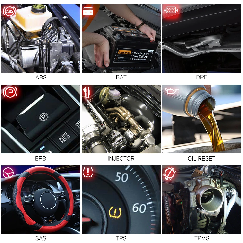 1. Сброс масла: позволяет выполнить сброс технического обслуживания и интервалы данных для нового расчета системы жизнедеятельности моторного масла после изменения масла. 2. Сброс TPMS: создает датчик tpms при отображении идентификаторов датчика из Эбу транспортного средства, вводит идентификационные номера датчика TPMS и активирует датчики tpms. 3. Регулировка инжектора: код дизельного инжектора требует идентификатора программирования и параметров в ECU для точной связи и системы управления впрыском 4. Сброс EPB: важно в обслуживании безопасности и эффективности электронной тормозной системы при замене тормозных колодок или двигателя 5.DPF: специально работает с дизельными сажевыми фильтрующими системами с регенерацией DPF, заменой компонентов DPF после замены блока управления двигателем. 6.TPS/датчик дроссельной заслонки: Датчик положения дроссельной заслонки транспортного средства подключен к шпинделю бабочки и в основном используется для контроля положения дроссельной заслонки в двигателе внутреннего сгорания. Из-за его расположения Датчик положения дроссельной заслонки способен эффективно наблюдать, где расположен Дроссельный клапан. 7. Кровотечение ABS: Автоматическая процедура кровотечения используется на оборудованных автомобилях BOSH 5,3. Эта процедура использует инструмент сканирования для цикла системы соленоидных клапанов и запуска насоса, чтобы очистить воздух от вторичных цепей. 8. Сброс SAS: помогает очистить воспоминания датчика угла поворота и играет важную роль в калибровке датчика угла поворота руля. 9. Изменение батареи: позволяет сканировать инструмент для оценки состояния заряда батареи, контролировать ток замыкания, зарегистрировать новую замену батареи и активировать остальное состояние системы аккумуляторной батареи транспортного средства